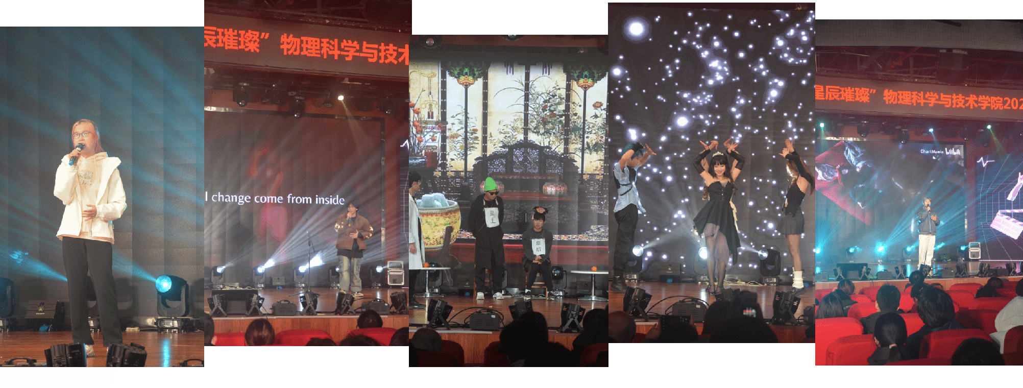 宇宙中炽热的恒星,照亮了今天的夜晚。物理青协以手势舞《星辰大海》为我们拉开了“尘封星域,点亮未知”的序幕。在这一篇章中徐武祎、庄志杰和何翰等人以他们的精彩表演调动了全场的气氛,让我们看到了新一届物理人的风采。除此之外,葛田田老师、彭文俊和张怡远等人的《帽子戏法》也让我们感受到了物理大家庭的热情与活力。最后,在唐梓健和蔡成淼的《年轮》中我们结束了这一篇章,物理这颗大树也又添了一道新的年轮。