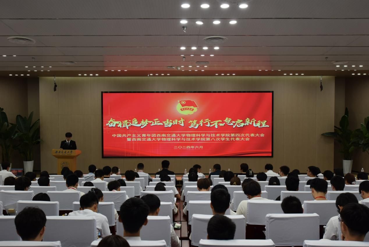 启航新征程,奋进在物理。6月20日下午,共青团西南交通大学物理科学与技术学院第四次代表大会暨第八次学生代表大会在犀浦校区图书馆二号报告厅隆重举行。校团委书记武俊,物理科学与技术学院党委副书记兼副院长郭剑,校学生会主席陈晓宇,来自各兄弟学院团委的负责同志,以及物理学院一百余位青年师生代表出席了大会开幕式,全校多个兄弟学院团委也通过贺信、贺电等方式向大会的召开表示热烈祝贺。