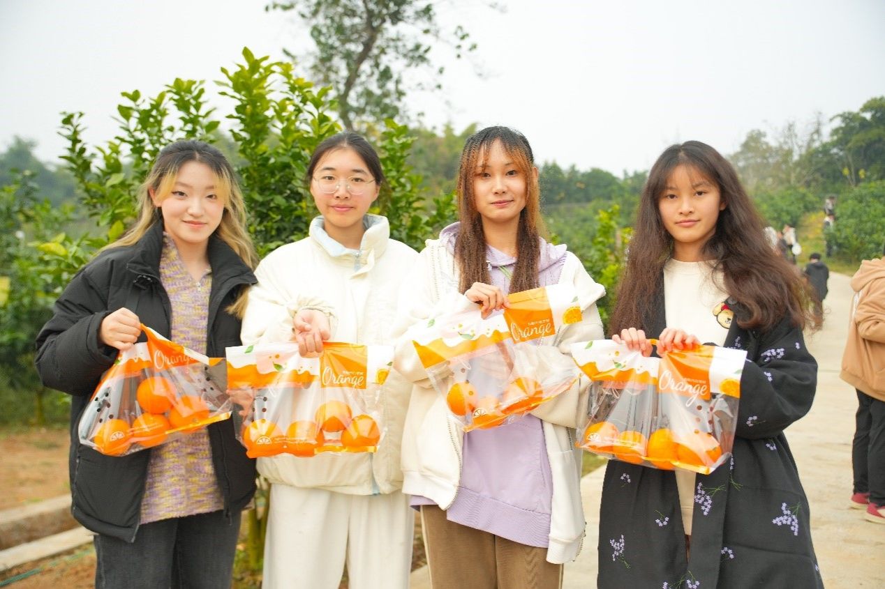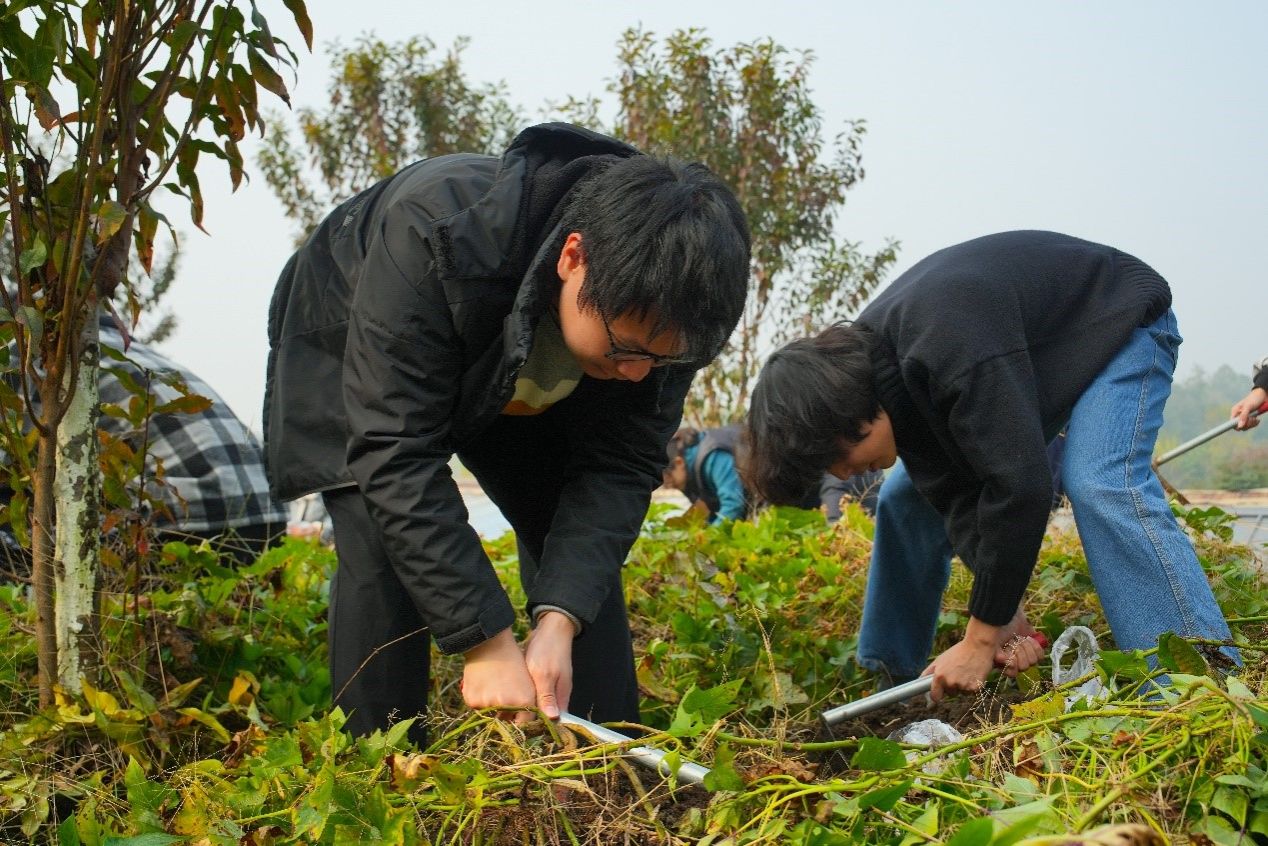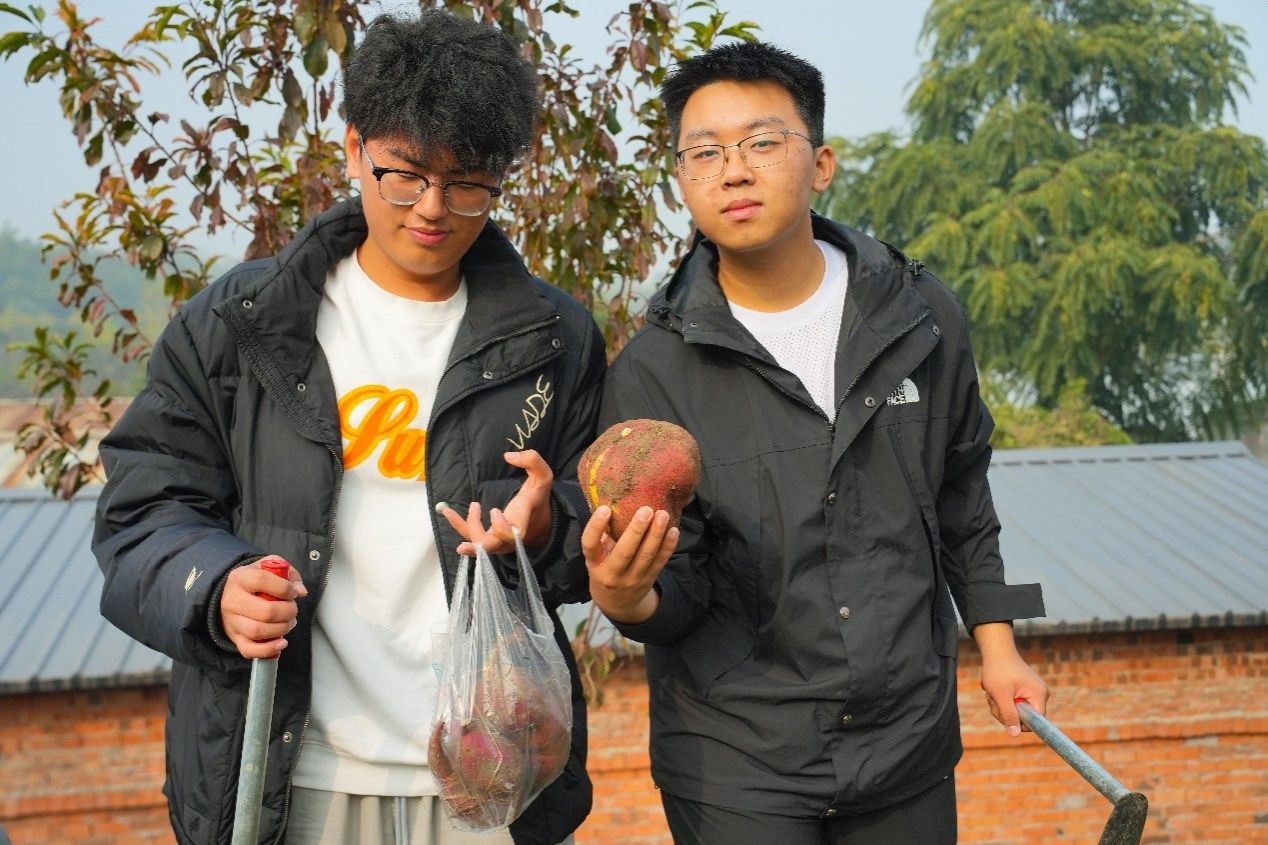红薯地里,成熟的红薯枝蔓相互缠连生机勃勃,同学们扛起锄头开始了一天的劳作。以往只在餐桌上见过的食材,同学们纷纷亲手挖掘,倍感幸福满足。田间地头道路纵横、坑洼崎岖,飞扬的泥巴粘在鞋上、手上,这让同学们愈发意识到劳动的艰辛与不易,更加珍惜劳动的果实和幸福。同学们还来到果园,一边亲手采摘橘子,一边向当地农户请教,进一步加深对农业生产和操作的了解认识。来到草地上,同学们支起烤箱来烤红薯,品尝自己的劳动成果,空气中弥漫着红薯和橘子的香甜,自己动手创造的劳动果实总是更加珍贵。