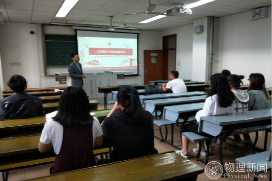 2019926日下午4点,物理研究生二党支部于逸夫楼4519教室开展了“共和国70年辉煌历程”主题党日活动,全体党员出席活动,会议由田川同志主持,学院副院长李金龙老师参会进行指导。