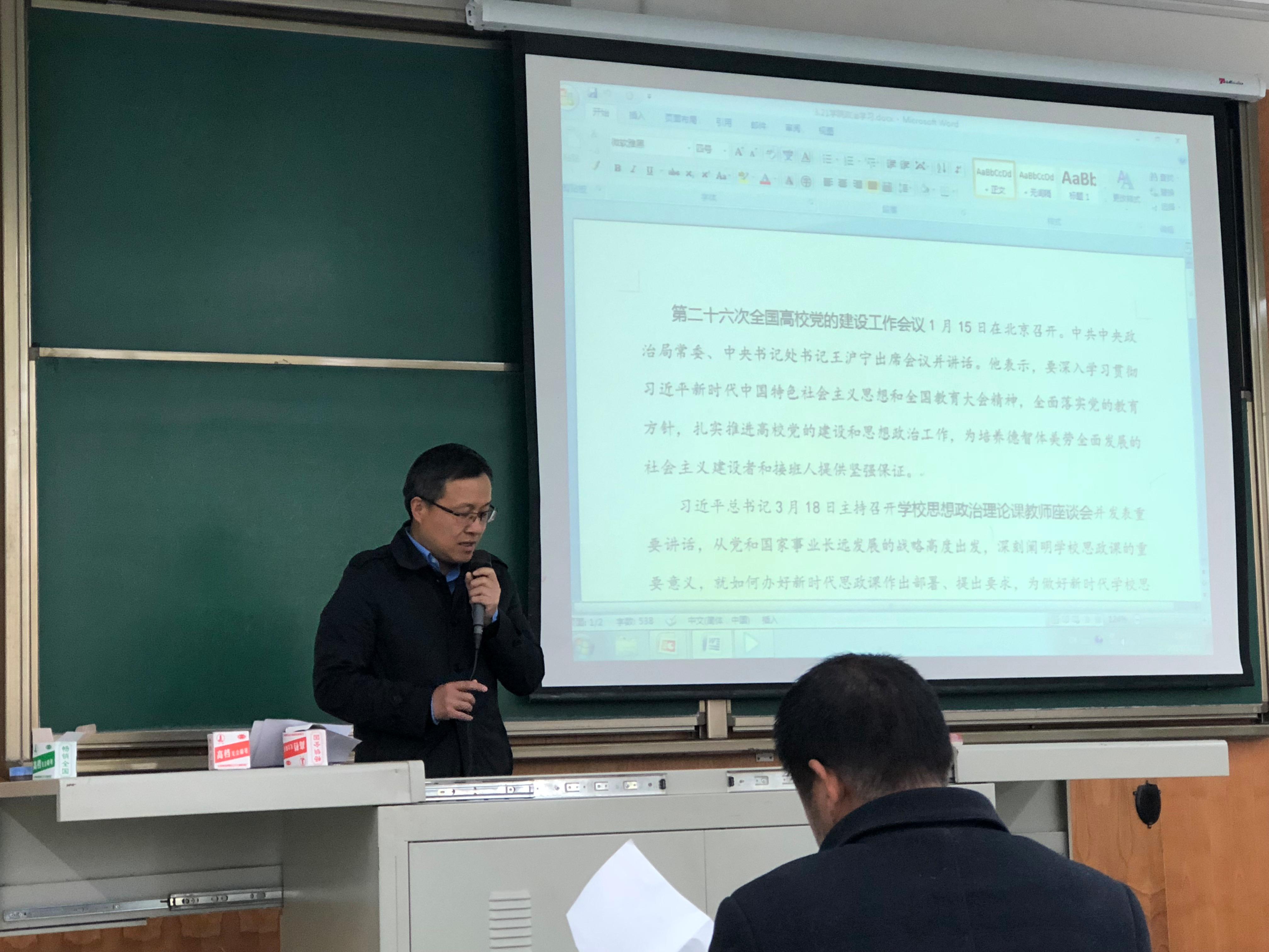 郭剑院长助理受学院党委委托,带领全体与会教职工再次共同学习了全国高校思想政治工作会议精神、十九大精神、全国教育大会精神等重点内容和知识。