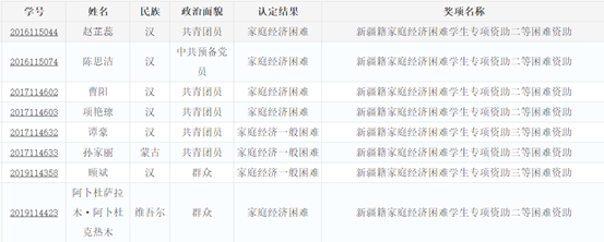 按照学院关于2020年新疆籍家庭经济困难学生专项资助评选工作的通知要求,经学生个人申请,辅导员审核,学院评审,按照申请条件,结合学生综合表现,确定物理学院推荐人选为以下同学: