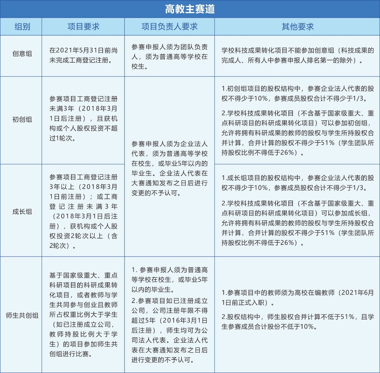 2.根据参赛项目所处的创业阶段、已获投资情况和项目特点,分为创意组、初创组、成长组、师生共创组。具体参赛条件如下: