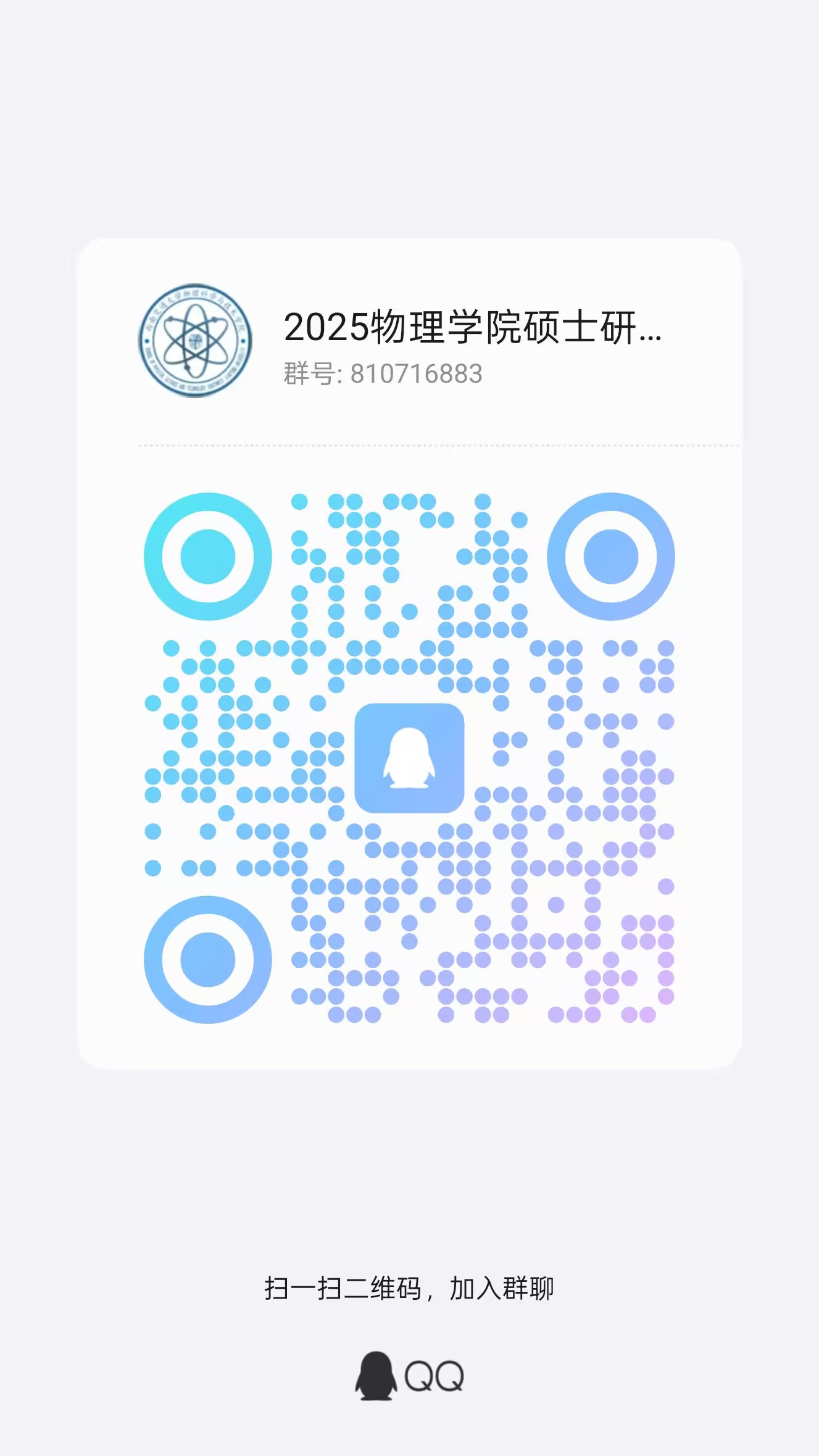 请2025级拟录取物理科学与技术学院硕士研究生,加入新生QQ群,群号810716883,申请入群时发送拟录取专业和姓名。