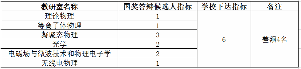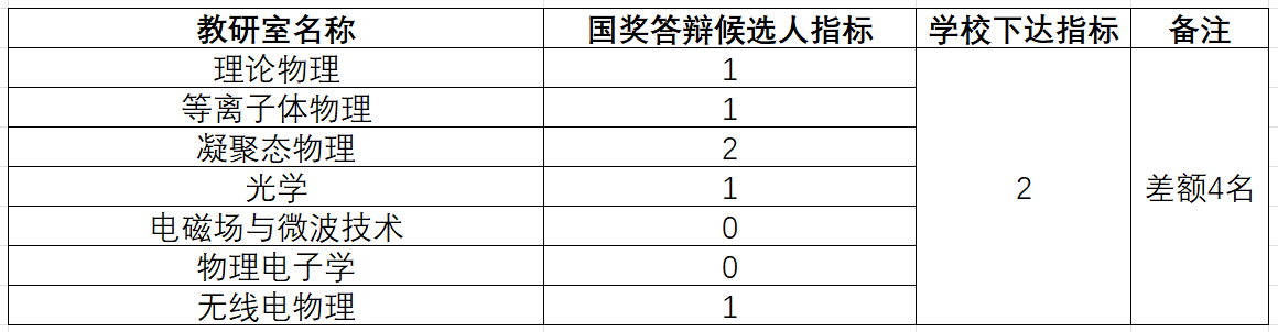1.根据《西南交通大学研究生国家奖学金管理办法》(附件1)和《物理科学与技术学院研究生国家奖学金评选实施细则》(附件2),由各教研室推荐国家奖学金答辩候选人,答辩候选人应自行提交相应的申请材料于教研室处审核,并在审核之后于2023年10月8日中午12点前将纸质材料提交至研究生教育教学中心。现将物理学院2023年国家奖学金各教研室答辩候选人指标分配公布如下:
