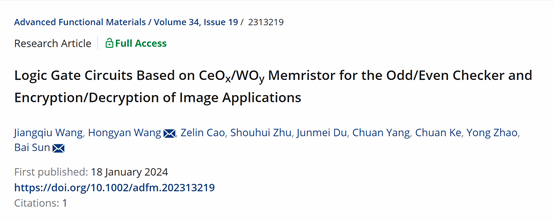 近期,西南交通大学物理科学与技术学院微纳器件和材料物理团队王红艳教授课题组在忆阻器的制备及应用研究中取得重要性研究进展,相关研究成果以西南交通大学物理科学与技术学院为第一单位,以“Logic Gate Circuits Based on CeOx/WOy Memristor for the Odd/Even Checker and Encryption/Decryption of Image Applications”为题,发表在材料学领域顶级期刊《Advanced Functional Materials》(IF=19.0)上,该论文第一作者为王红艳教授指导的硕士研究生王江秋,通讯作者为物理科学与技术学院王红艳教授和西安交通大学孙柏教授。