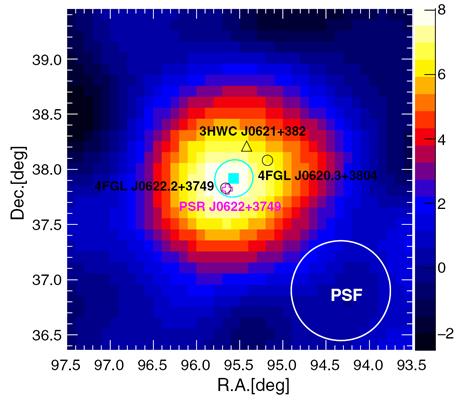 此外,LHAASO合作组科研人员还在一颗中等年龄(约21万年)脉冲星PSR J0622+3749周围发现了迄今为止第三例延展伽马辐射晕现象(图3),并首次探测到此类延展晕0.1 拍电子伏以上的辐射。与之前发现晕的两颗脉冲星相比,这个源距离地球要远5倍以上,LHAASO的高灵敏度对于这个晕的发现至关重要。LHAASO的观测结果表明高速旋转(周期小于1秒)的中等年龄脉冲星周围可能普遍存在高能伽马辐射晕,对这类源的系统研究将有助于我们揭示脉冲星中的粒子加速和传播特征。这一研究成果在Physical Review Letters上刚刚发表https://doi.org/10.1103/PhysRevLett.126.241103),并被美国物理学会网站选为亮点成果加以报道(https://physics.aps.org/articles/v14/s77)。