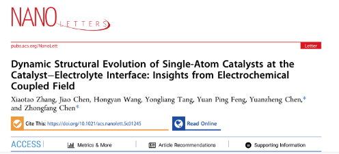 近日,西南交通大学物理科学与技术学院微纳器件和材料物理团队―陈元正课题组在单原子催化剂研究中取得重要研究进展,相关研究成果以西南交通大学物理科学与技术学院为第一单位,以“Dynamic Structural Evolution of Single-Atom Catalysts at the Catalyst−Electrolyte Interface: Insights from Electrochemical Coupled Field”为题,发表在纳米科学领域顶级期刊《Nano Letters》(Q1, IF=9.6),该论文第一作者为陈元正副教授指导的硕士生张霄涛,通讯作者为物理科学与技术学院陈元正副教授和美国波多黎各大学陈中方教授。