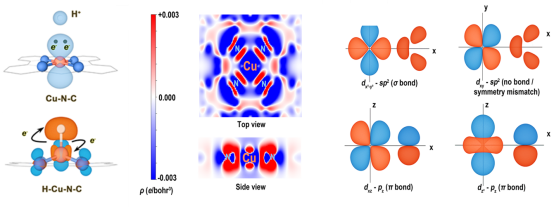 在此项工作中,陈元正课题团队揭示了Cu-N-C单原子催化剂在电化学工作条件下的动态结构演变规律诱因,阐明了电化学耦合场对其结构演化与催化特性的调控作用。通过恒电位方法耦合溶剂效应模拟,发现铜原子d⁹电子构型诱导的费米能级处独特dx²−y²轨道占据特性,导致Cu-N键对外加电压具有超常敏感性。质子转移过程引发电子重排,促使离散能级向费米能级附近连续态转变,显著增强Cu-N反键态的电荷累积,最终导致键合弱化与铜原子溶出。该工作为真实电化学环境下单原子催化剂的动态行为提供了基础理论认知,同时为理论设计高稳定性电催化剂提供了全新视角。