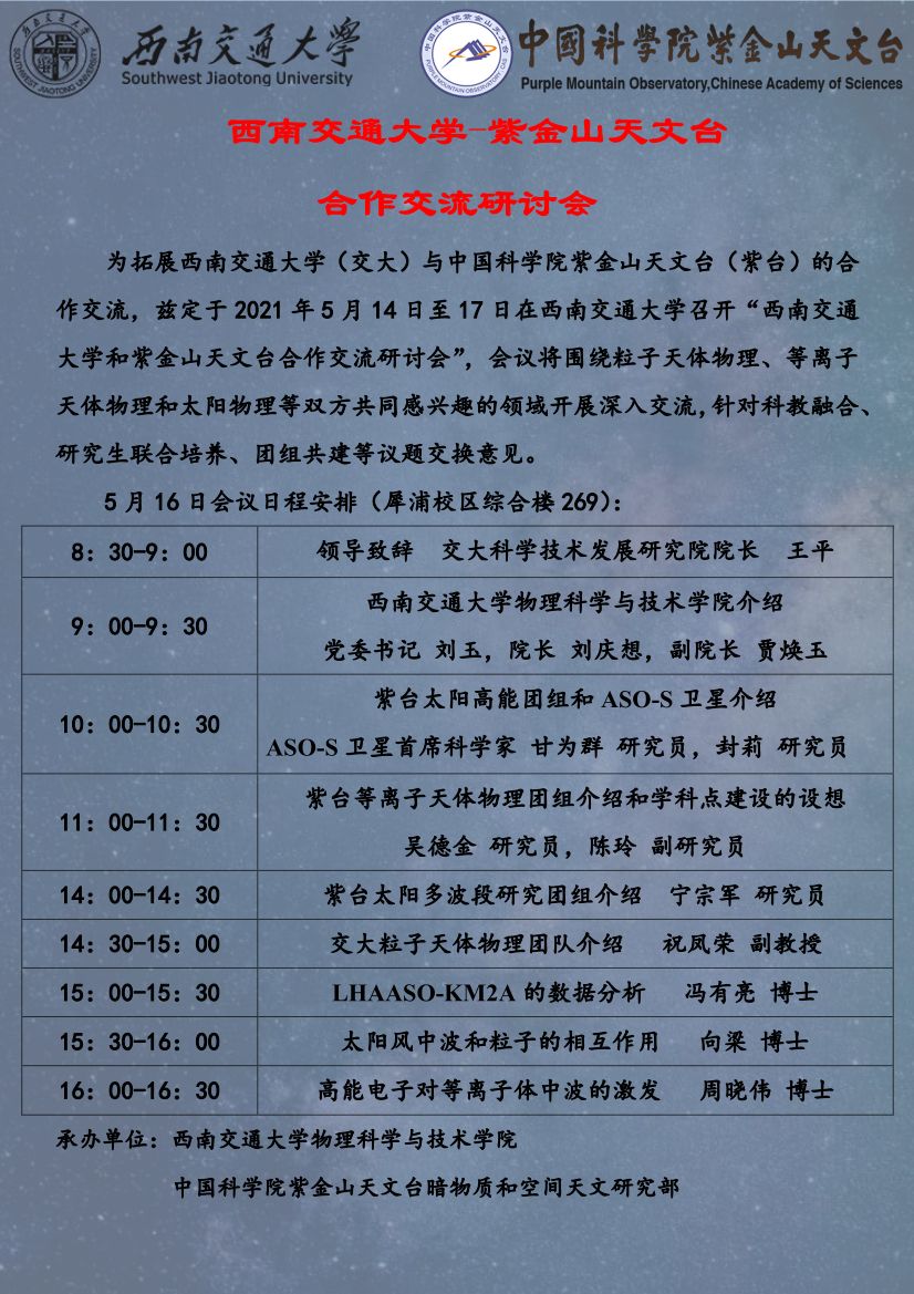 为拓展西南交通大学与中国科学院紫金山天文台的合作交流,兹定于2021年5月14日至17日在西南交通大学召开“西南交通大学和紫金山天文台合作交流研讨会”,会议将围绕粒子天体物理、等离子天体物理和太阳物理等双方共同感兴趣的领域开展深入交流,针对科教融合、研究生联合培养、团组共建等议题交换意见。