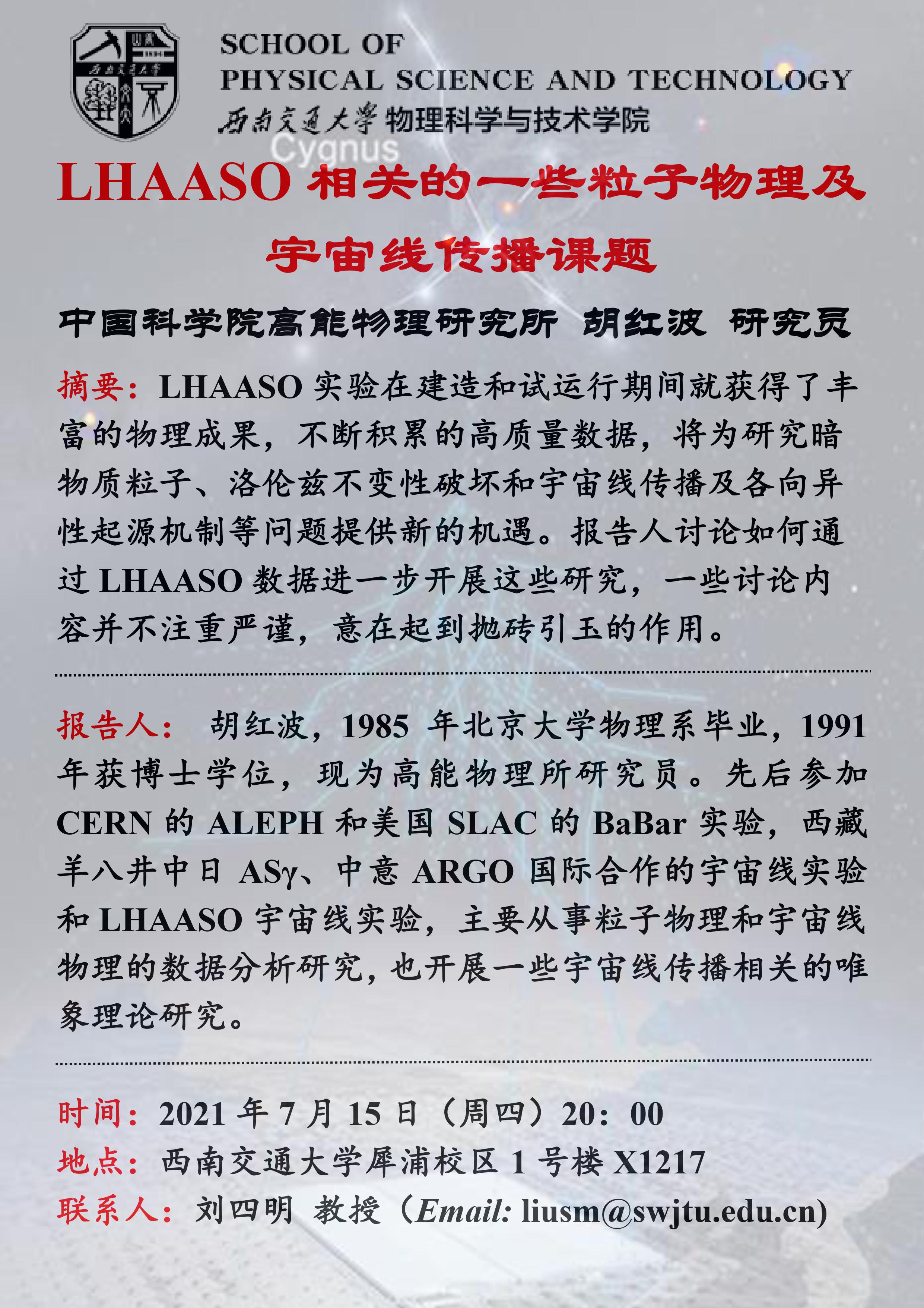 报告人简介:胡红波,1985年北京大学物理系毕业,1991年获博士学位,现为高能物理所研究员。先后参加CERN的ALEPH和美国SLAC的BaBar实验,西藏羊八井中日ASγ、中意ARGO国际合作的宇宙线实验和LHAASO宇宙线实验,主要从事粒子物理和宇宙线物理的数据分析研究,也开展一些宇宙线传播相关的唯象理论研究。