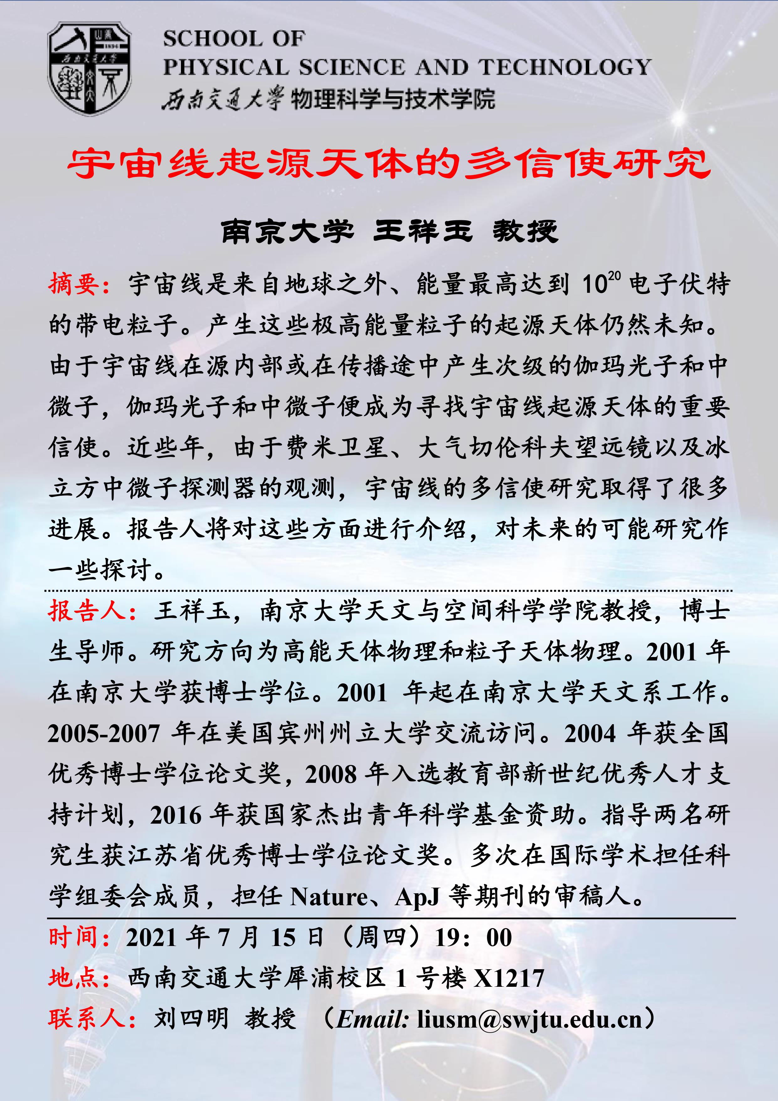 报告人简介:王祥玉,南京大学天文与空间科学学院教授,博士生导师。研究方向为高能天体物理和粒子天体物理。2001年在南京大学获博士学位。2001年起在南京大学天文系工作。2005-2007年在美国宾州州立大学交流访问。2004年获全国优秀博士学位论文奖,2008年入选教育部新世纪优秀人才支持计划,2016年获国家杰出青年科学基金资助。指导两名研究生获江苏省优秀博士学位论文奖。多次在国际学术担任科学组委会成员,担任Nature、ApJ等期刊的审稿人。