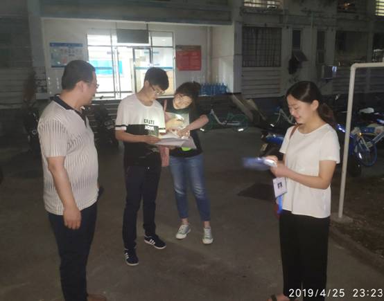 为了进一步落实学生宿舍管理制度,维护学生正常生活秩序,保障学生安全,加强对学生行为的引导和管理,严格落实我校本科生晚出晚归行为管理工作。2019年4月25日晚11时,在物理科学与技术学院党委副书记、副院长郭剑带领下,全体辅导员分4组在南区、北区开展了本科生晚出晚归专项检查。