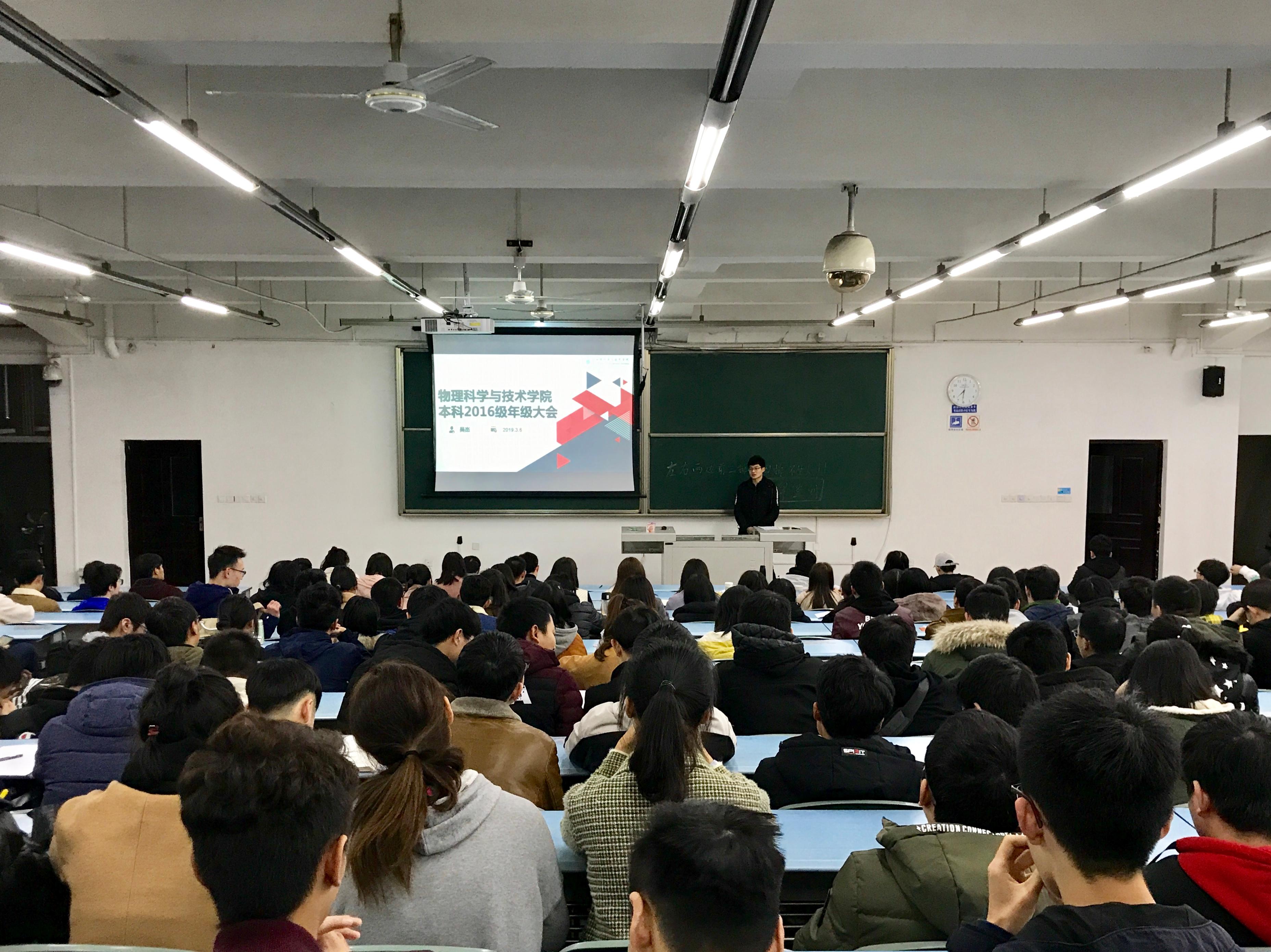 3月6日晚7时30分,物理科学与技术学院2016级大三下学期第一次年级大会于X2321准时召开,由2016级辅导员吴杰老师担任主持。