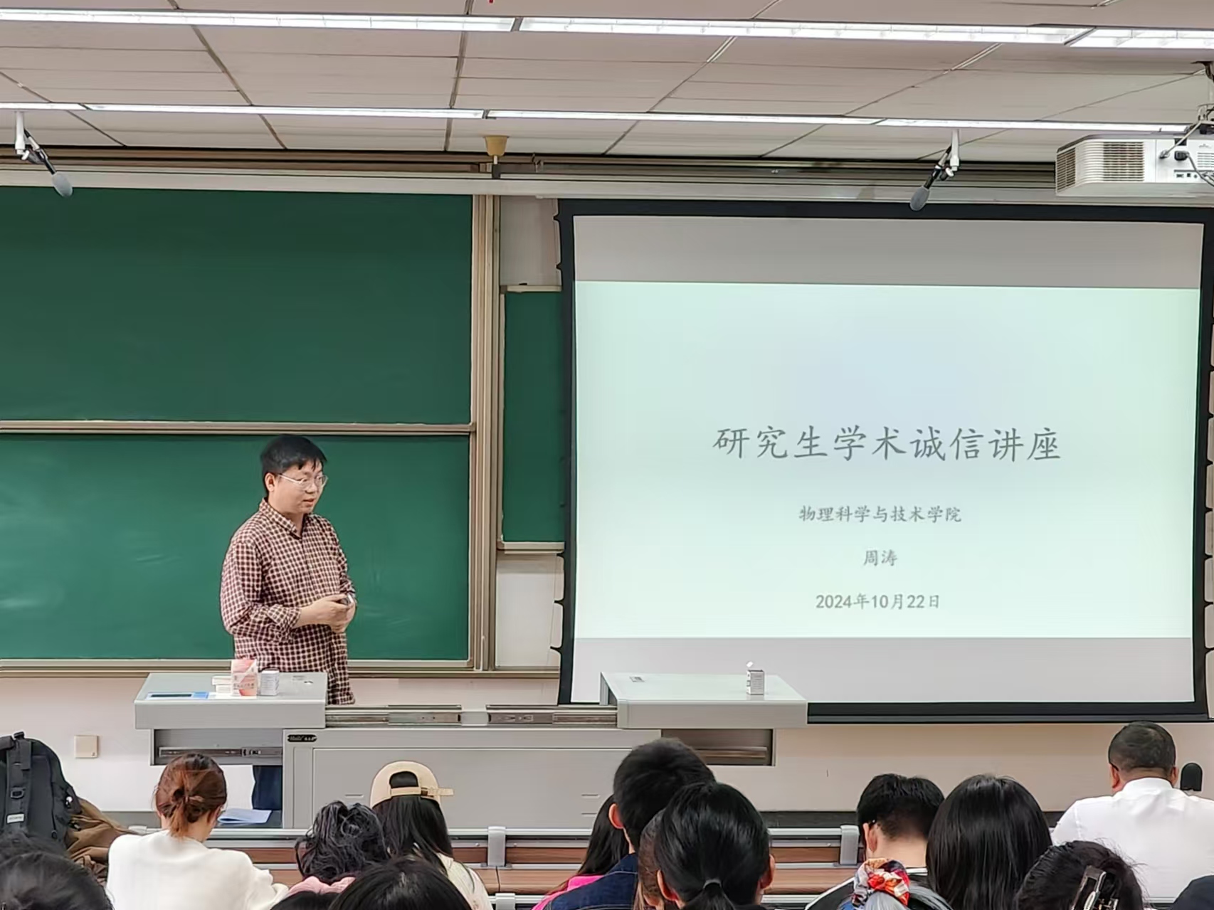 学术诚信,守望初心。接下来,周涛副教授为同学们带来了“研究生学术诚信”专题讲座。周老师从学术不端行为的定义和危害入手,结合具体案例,深入剖析了科研诚信的重要性。在讲座中,周老师详细解释了学术不端的多种形式,包括抄袭、篡改数据、伪造实验结果、重复发表等行为,强调这些行为不仅违反了学术道德,也会严重损害学术界的声誉。通过列举国内外典型的学术不端事件,周老师让同学们深刻认识到学术不端行为所带来的广泛负面影响:不仅会对当事人带来严重后果,还可能对学术机构、研究团队及整个学术界的公信力造成不可挽回的损失。周老师特别提醒同学们,在高水平的学术研究中,求真务实、严谨细致是至关重要的。他指出,科研工作不仅是学术上的探索,也是对道德的考验。只有坚守诚信、遵守学术规范,才能获得持久的学术进步。周老师鼓励大家,作为研究生,要在日常学习和科研中始终保持自律、慎重对待实验数据和研究成果,努力培养独立的学术精神和严谨的治学态度。最后,周老师勉励同学们要积极弘扬科学精神,坚守科研道德,杜绝一切学术不端行为,珍惜和维护良好的学术声誉,以真实、规范的研究成果为学术界和社会贡献自己的力量,为构建诚实、守信的学术氛围添砖加瓦。
