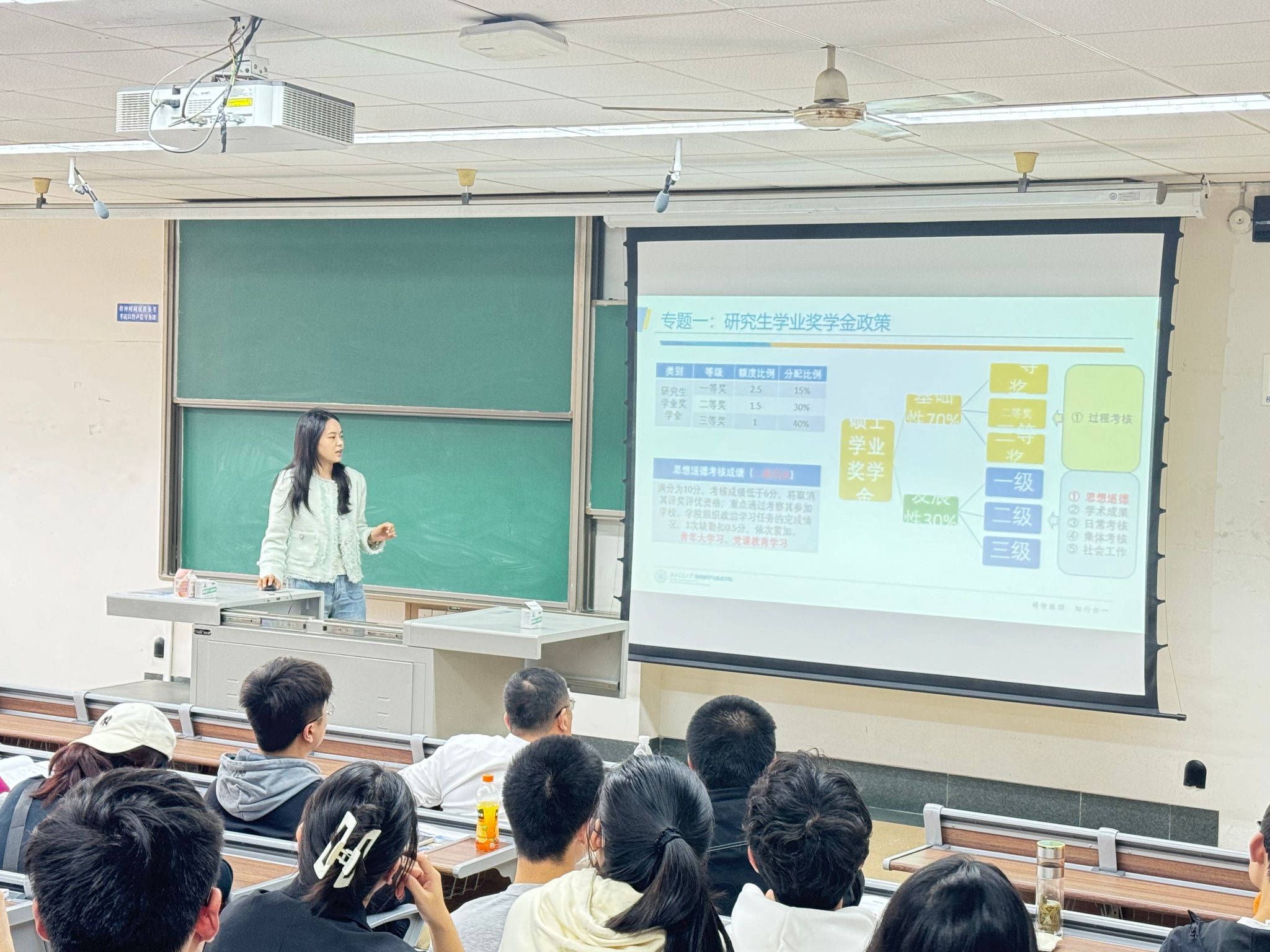 评优助力,逐梦扬华。何迪雅老师为大家介绍了评奖评优细则。她详细解读了研究生学业奖学金和国家奖学金的评审标准,明确了评优的具体流程和荣誉称号的评定程序。何老师强调,评奖评优不仅是对学术成绩的认可,也是对个人综合素质的全面考察,因此她鼓励同学们在学业上追求卓越,在科研中取得优异成果,积极参与评优活动,全面提升个人能力。此外,何老师还根据西南交通大学学生个人最高荣誉——竢实扬华奖章,向新生寄语:“‘是等待的意思,而代表果实,二者结合寓意着等待果实成熟。她希望同学们在入学阶段能够脚踏实地,扎实学习和科研,积累知识与经验,最终在毕业时结出属于自己的丰硕果实,实现自己的目标和梦想。