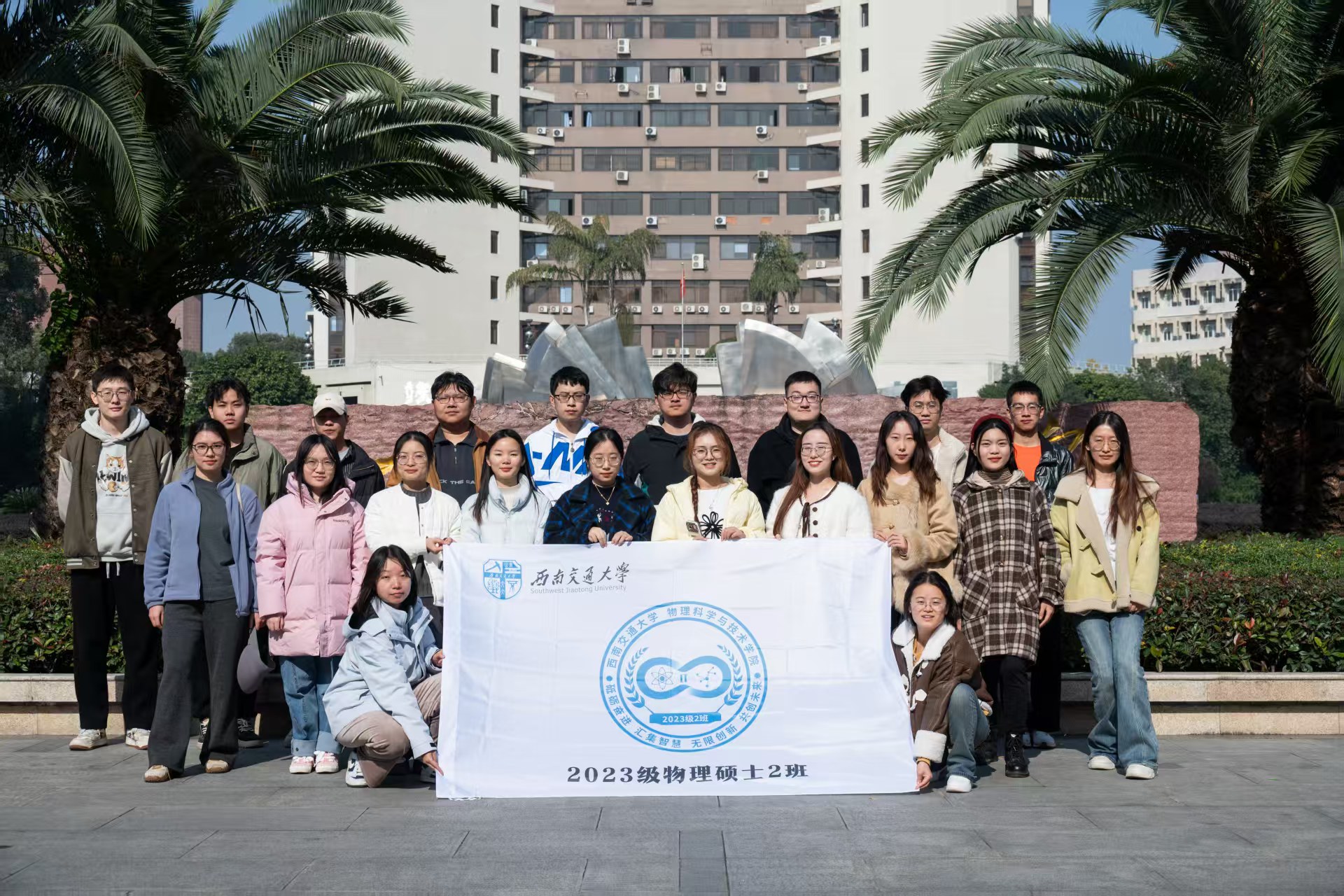 独特的“团队配方”铸就了班级稳定且富有活力的集体文化。班级由26名同学组成,其中女生15人、男生11人,3名班委分工明确、协同发力,带领全体同学凝心聚力、共促发展。设计以无限符号为主体,融入原子分子结构与月桂枝元素的专属班徽,既彰显物理学专业根基与探索无限的科研精神,又寄托追求卓越、收获成果的集体愿景;秉持“研途奋进汇智慧,无限创新共未来”的班级口号,形成了职责清晰、协作紧密、向上向善的优良班风,为集体发展注入不竭动力。