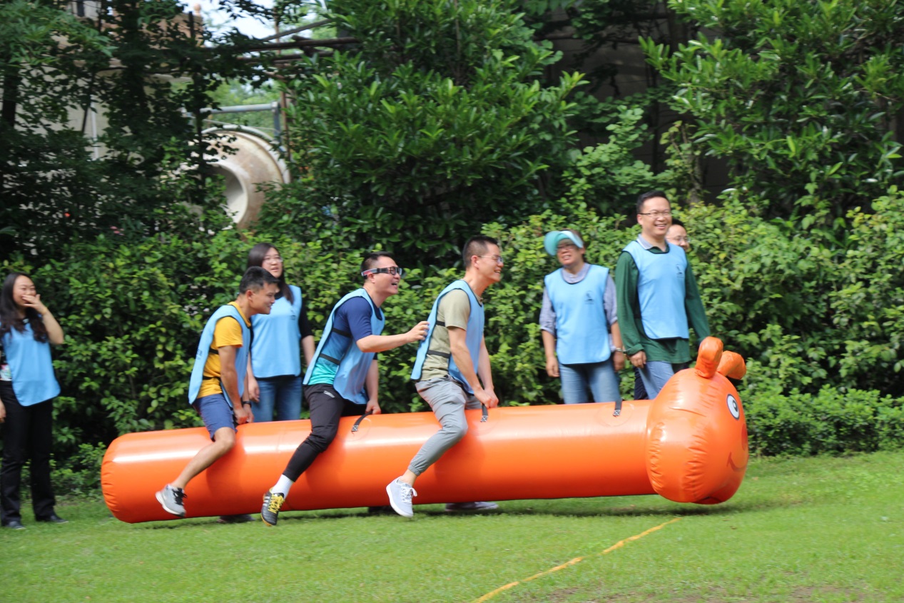 活动伊始,在素质拓展教练的组织下开展了热身运动,随即将教师们分为红、绿、蓝3个不同的团队,经各队队员讨论与设计,红队取名“亮子队”、蓝队取名“蓝精灵队”、绿队取名“绿巨人队”,并进行了四场别开生面的团队间友谊竞赛。