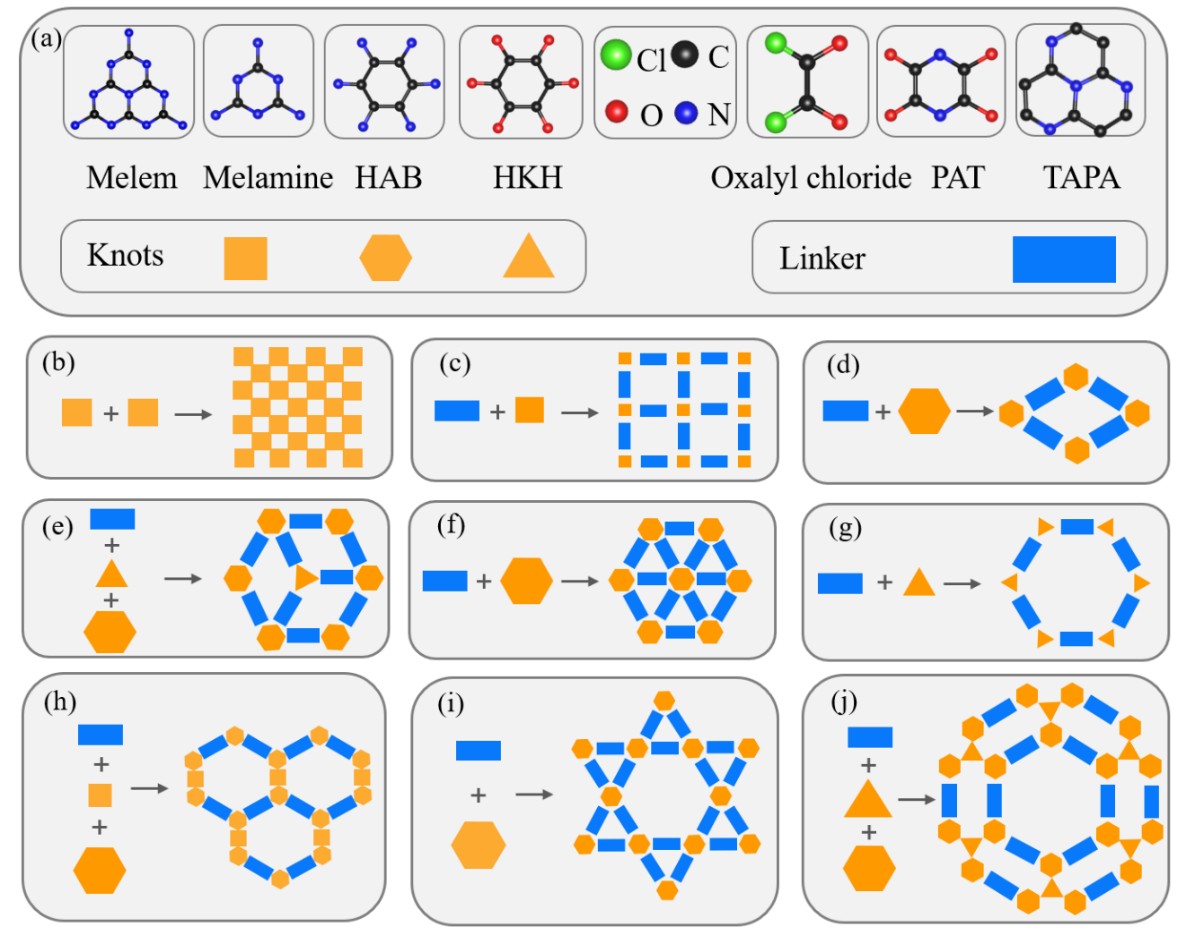 图2.(a) 有机框架结构数据库中不同有机结构单元示例,(b-j)基于学习多种有机框架结构单元所构建的二维多孔碳氮框架构型示例。