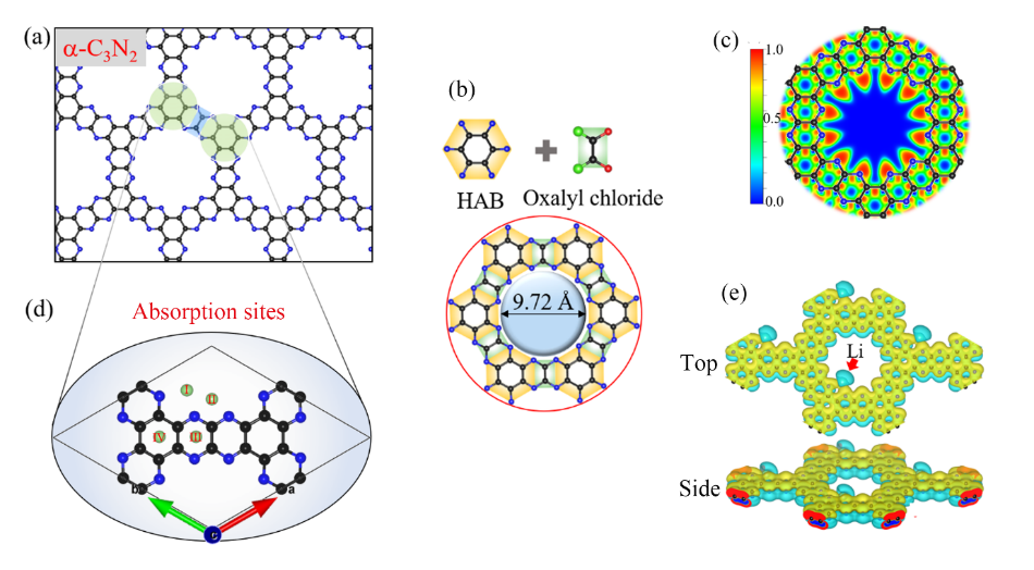 图3.(a)设计构建的a-C3N2框架结构图,(b) 构成a-C3N2结构框架的有机结构单元,(c)a-C3N2结构孔状单元电子局域函数,(d)a-C3N2结构吸附锂原子的活性位点。