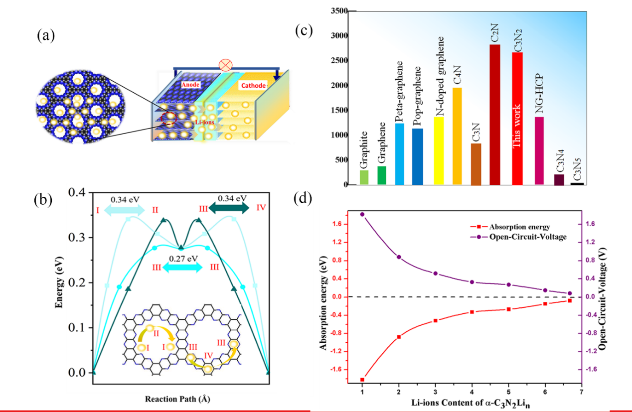 图4.(a)提出的a-C3N2作为锂电池阳极材料储能设备模型,(b) 在a-C3N2结构框架中不同路径下锂离子迁移垒,(c)a-C3N2结构锂离子储能最大比容量与石墨、石墨烯及碳基材料等对应值比较柱状图,(d)a-C3N2结构随吸附锂原子数增加对应的吸附能和开路电压曲线图