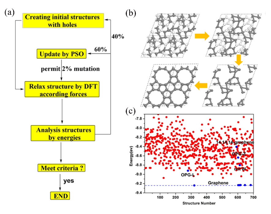 图1.(a)基于群智算法和密度泛函理论计算开展二维孔状结构搜索流程图;(b)采用占位虚原子技术产生孔状二维结构示意图;(c)对碳体系开展孔状设计搜索的测试结果。