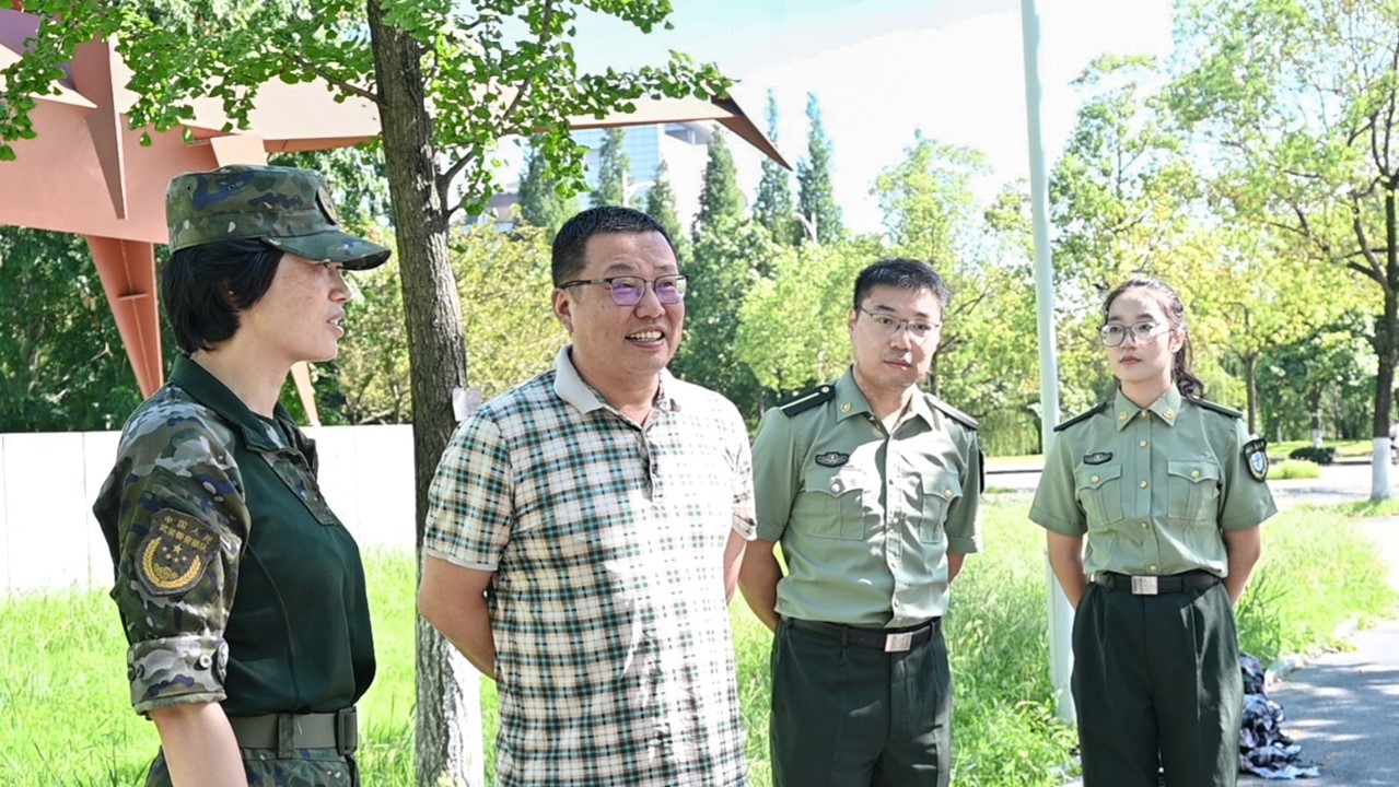 飒爽迷彩风,军训进行时。2023年8月27日上午10时,西南交通大学物理科学与技术学院党委副书记兼副院长郭剑在学院军训指导员杨昊戬、葛田田陪同下走访军训现场,看望慰问正在军训的2021级本科生。