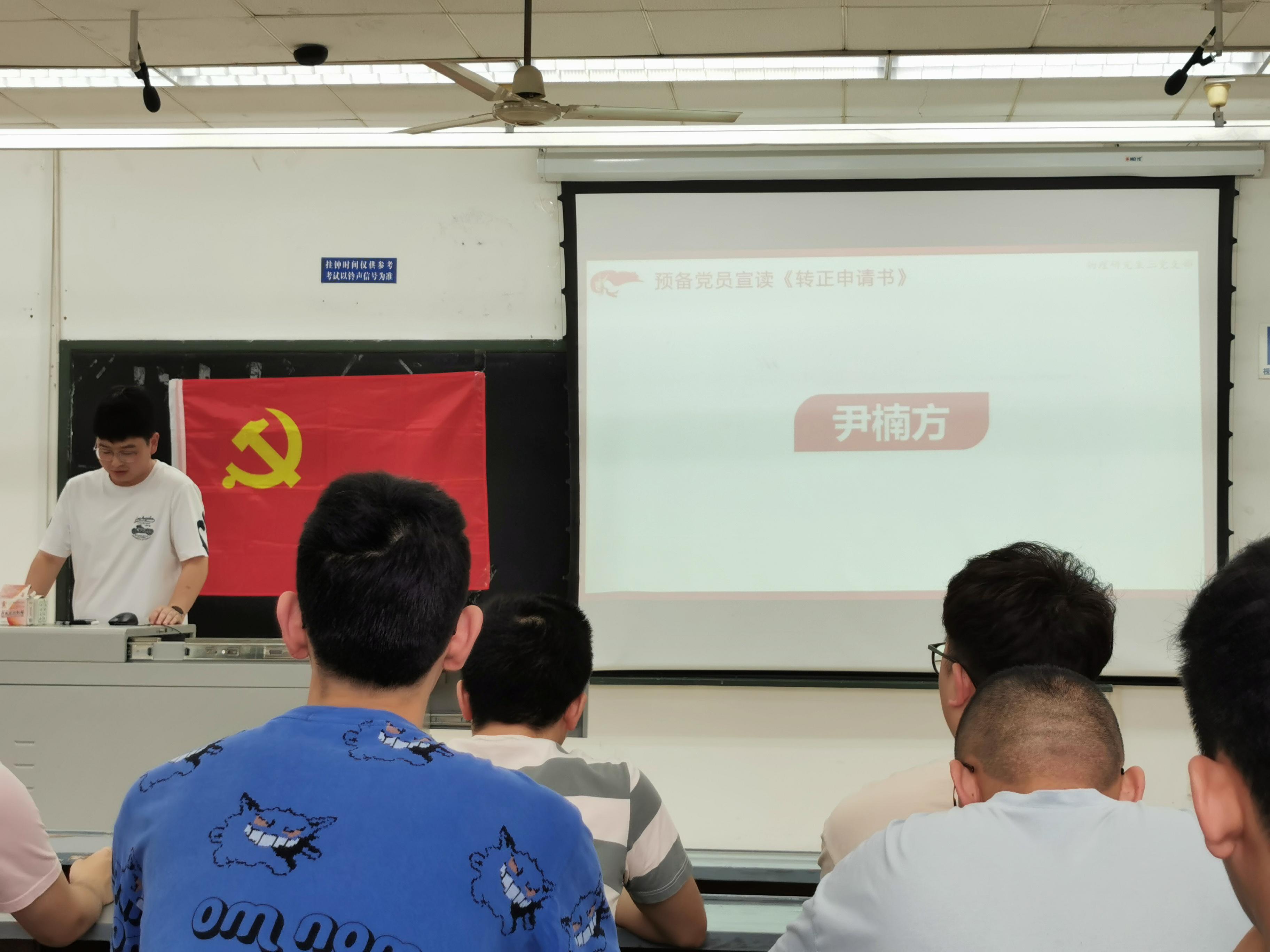 尹楠方同志宣读了个人《转正申请书》,他详细总结了自己在预备期内思想、学习、工作和生活等方面的表现,并表达了自己对成为一名正式党员坚定不移的决心。