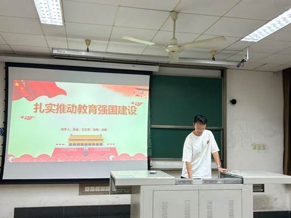 2023年9月26日19时30分,物理学院研究生四党支部在逸夫楼4420教室开展“扎实推动教育强国建设”主题党日活动。物理学院研究生四党支部书记杨昊戬和全体党员参加了此次活动,活动主要内容由第一组成员吴潇进行学习分享。