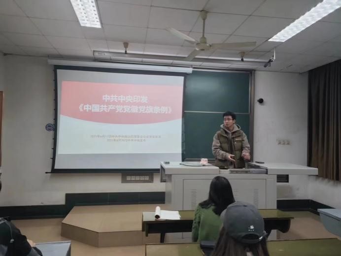 然后,文鹏旭同志宣读了中共中央印发的《中国共产党党徽党旗条例》,并要求支部成员严格遵守相关规定,遵守党徽党旗的使用要求。