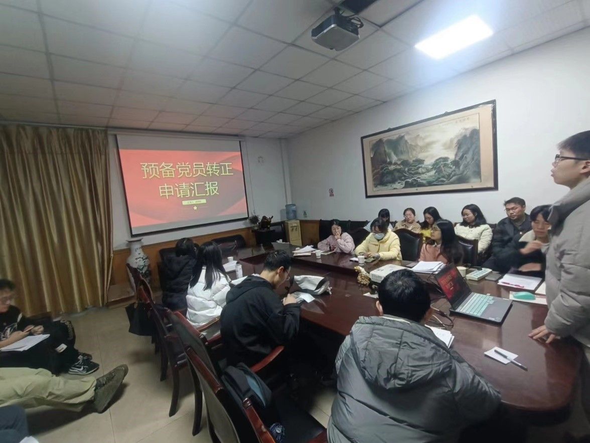 会议第一项,发展对象宣读《入党申请书》。会议第二项,入党介绍人介绍申请人的情况并表明是否同意发展其入党的意见。会议第三项,宣传委员王玺程代表支委会向支部大会汇报对入党申请人袁文硕、施鑫辉、王晓霞的培养教育考察和政审情况。会议第四项,与会党员对发展对象是否满足转为预备党员进行投票表决。与会党员通过无记名投票的方式,对发展对象是否满足转为预备党员进行表决。会议第五项,组织委员谭嘉豪宣读支部表决决议。会议第六项,发展对象表态发言。袁文硕、施鑫辉、王晓霞3位同志表明对支部决定的尊重与服从的态度,不论结果如何,都将继续保持积极向上、勤奋学习的决心,并且坚定不移地按照党的要求努力提升自己。会议第七项,宣读入党誓词。组织委员谭嘉豪带领各位同志宣读入党誓词,全体党员共同高举右拳,齐声宣读入党誓词。