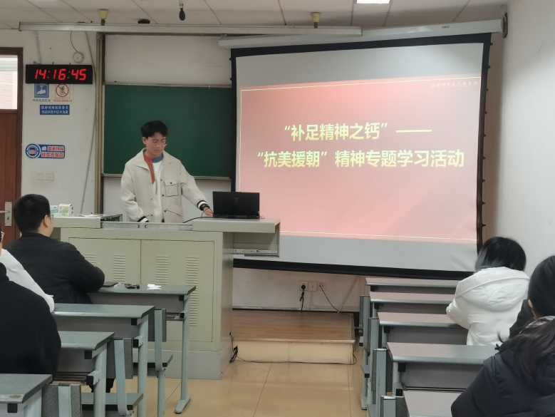 10月17日下午14时,物理学院研究生三党支部在J4519成功开展“补足精神之钙”——抗美援朝精神专题学习活动和“淬炼思想之魂”——《志愿军:存亡之战》红色主题影片观影活动。此次活动旨在通过深入学习和回顾“抗美援朝”战争的历史意义,激发广大党员同志的爱国情怀,强化党性修养,补足精神之钙,增强理想信念,并通过观看红色主题影片,进一步弘扬革命精神,坚定理想信念,淬炼党员同志们的思想之魂,提升党性修养。