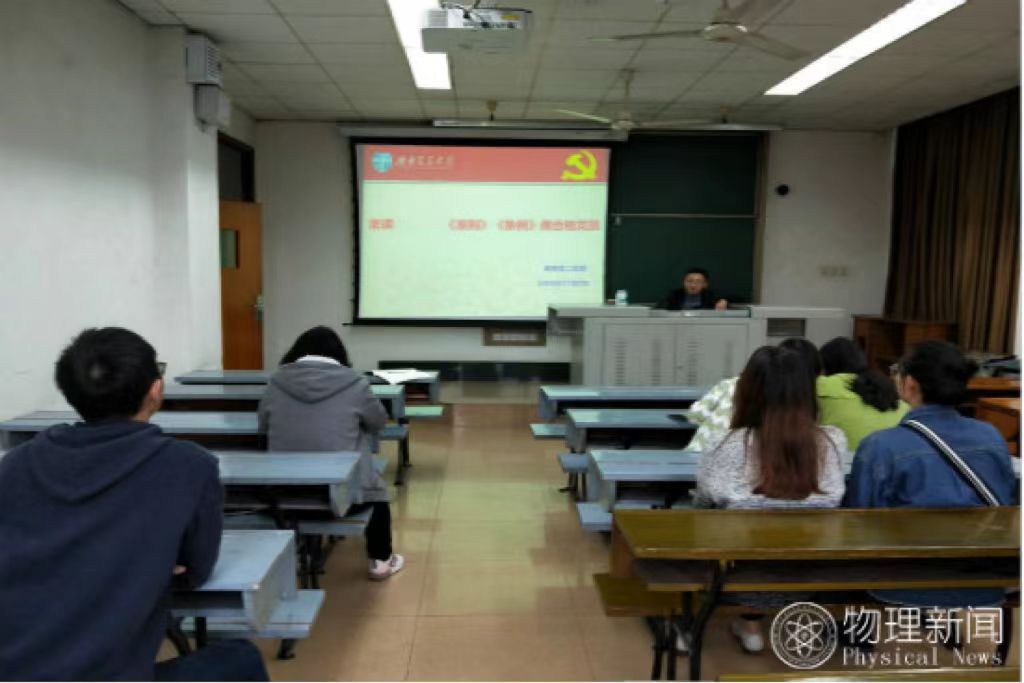 2019年11月7日下午4点,物理研究生二党支部于逸夫楼4420教室开展了“重读《中国共产党章程》《准则》《条例》做合格党员”主题党日活动,支部党员出席活动,本次活动由田川同志主持。
