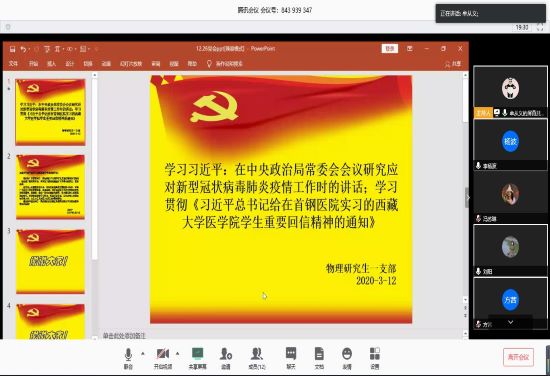 2020年3月12日14:00时,中共西南交通大学物理科学与技术学院研究生一党支部开展“学习习近平总书记在中央政治局常委会会议研究应对新型冠状病毒肺炎疫情工作时的讲话精神以及学习贯彻《习近平总书记给在首钢医院实习的西藏大学医学院学生重要回信精神的通知》”线上主题党日活动,会议由牟从义同志主持。