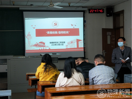 2020年10月22日下午4点,物理研究生二党支部于逸夫楼4421教室开展了“青春的我 、信仰的光”主题党日活动,由杜艺华同志担任主持,支部党员出席活动,李金龙老师参会进行指导。