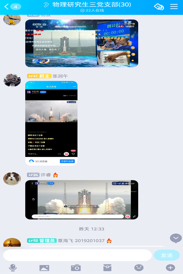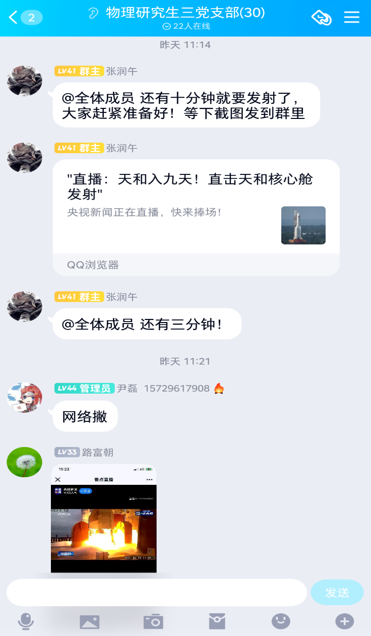2021年4月29日11:15,物理学院研究生三党支部举办“我们的目标是星辰大海”直播观看活动。三党支部全体党员和物理研究生五班全体团员均在线上参与了活动。活动由党支部副书记张润午同志主持。