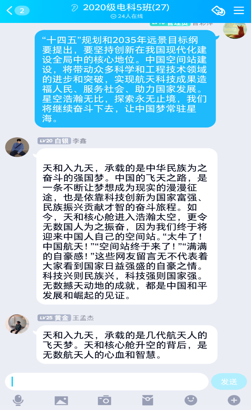 部分同志的发言有以下内容。覃海飞同志说,天和入九天,是我国航天事业的一大壮举,我们即将拥有自己的空间站。正如那句话,我们的征途是浩瀚星辰,愿即将发射的神舟十二号载人航天火箭同样取得巨大成功。团员李鑫说,这一壮举说明中国在中国共产党的带领下必将实现中华民族的伟大复兴。