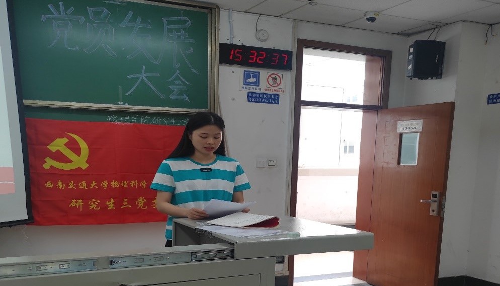 2021年5月27日15:00,物理学院研究生三党支部在九里校区4305A举办了党员发展大会。党支部书记周玲同志、三党支部全体党员和七名发展对象参与了此次大会。活动由党支部组织委员覃海飞同志主持。