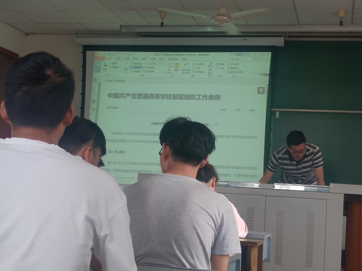 最后,张润午同志带领全体党员学习了《中国共产党普通高等学校基层组织工作条例》并希望大家能够按照条例的要求严格要求自己,做一名合格的共产党员。