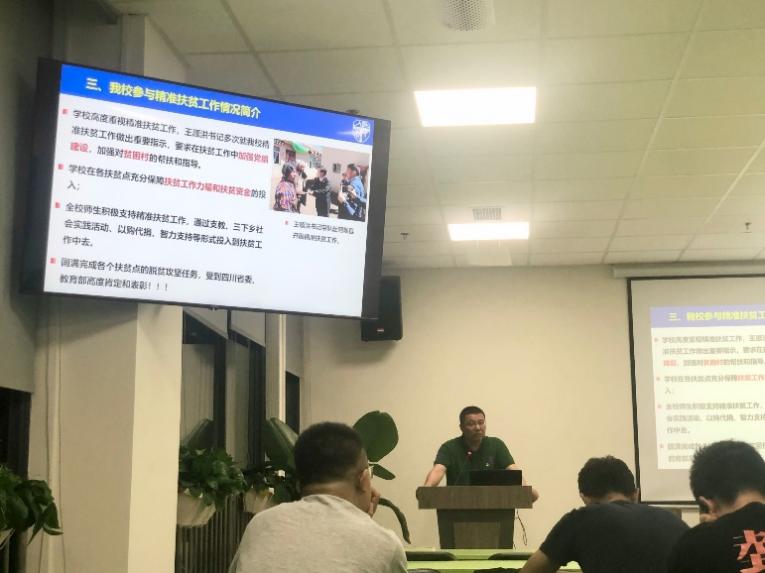 课上,郭剑副书记为大家介绍了我校参与精准扶贫工作的情况与成果。自2015年来,学校党政高度重视,提高政治站位,勇于担当,在各个扶贫点充分保障扶贫工作力量和扶贫资金投入,全校师生积极参与和支持精准扶贫工作,圆满完成各个扶贫点的脱贫攻坚任务,受到教育部和四川省委高度肯定和表彰。