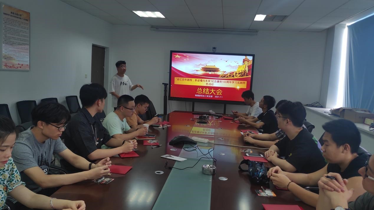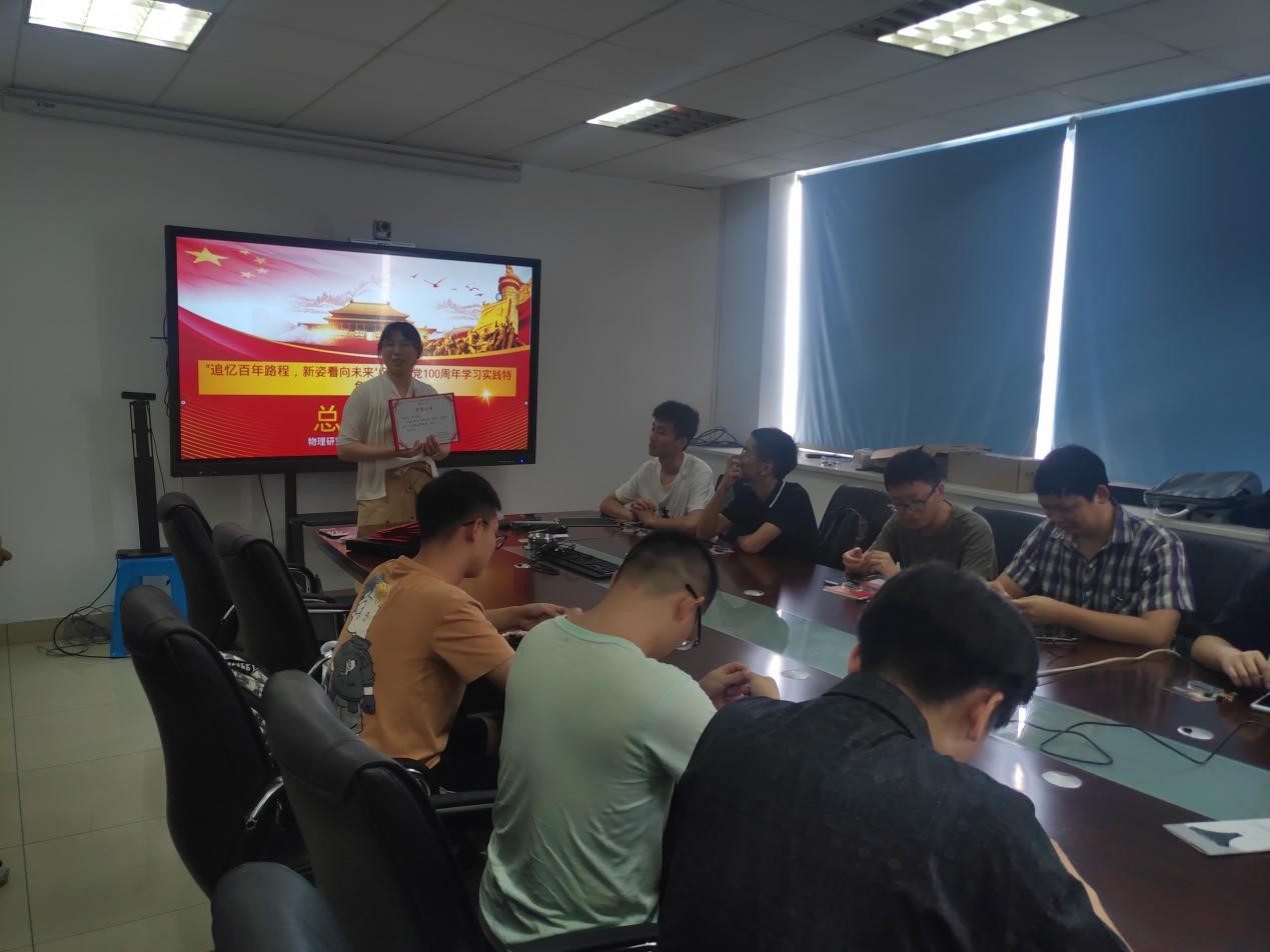 2021年7月1日下午16:00,物理学院研究生三党支部于犀浦校区5527举办“追忆百年路程,新姿看向未来”庆祝建党100周年学习实践总结大会暨“迎党的生日,讲初心故事,悟红色使命”主题党日活动。活动由党支部书记周玲同志主持,研究生三党支部全体成员参加此次活动。
