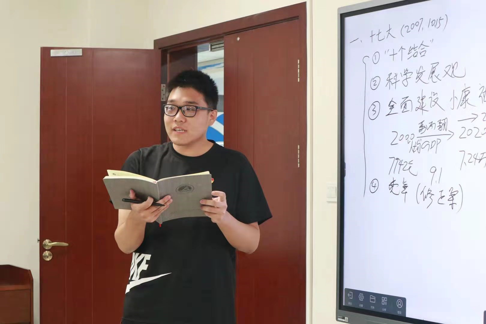 王彪给大家分享了十七大上,胡锦涛所作题为《高举中国特色社会主义伟大旗帜,为夺取全面建设小康社会新胜利而奋斗》的报告。首先,大会对改革开放的宝贵经验做了“十个结合”的精辟概括。接着,大会对科学发展观的时代背景、科学内涵,精神实质以及根本要求进行了全面系统的阐述。之后,大会对全面建设小康社会作了全面部署。并且大会审议通过了《中国共产党章程》修正案。还创造性的提出并阐述了“中国特色社会主义理论体系”,同时指出,科学发展观是中国特色社会主义理论体系重大创新成果,决定将其写入党章。我们作为这段历史的见证者,应为党和国家作出的历史成就感到自豪;同时我们也将是两个百年梦的实践者和参与者,并带领大家一起重温了同一时期提出的高校辅导员誓词,大家应为实现中华民族伟大复兴的中国梦而奋斗。