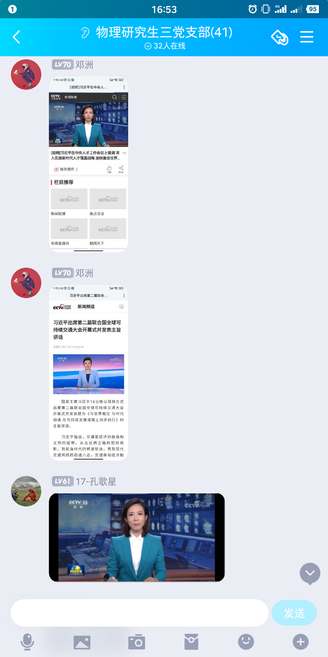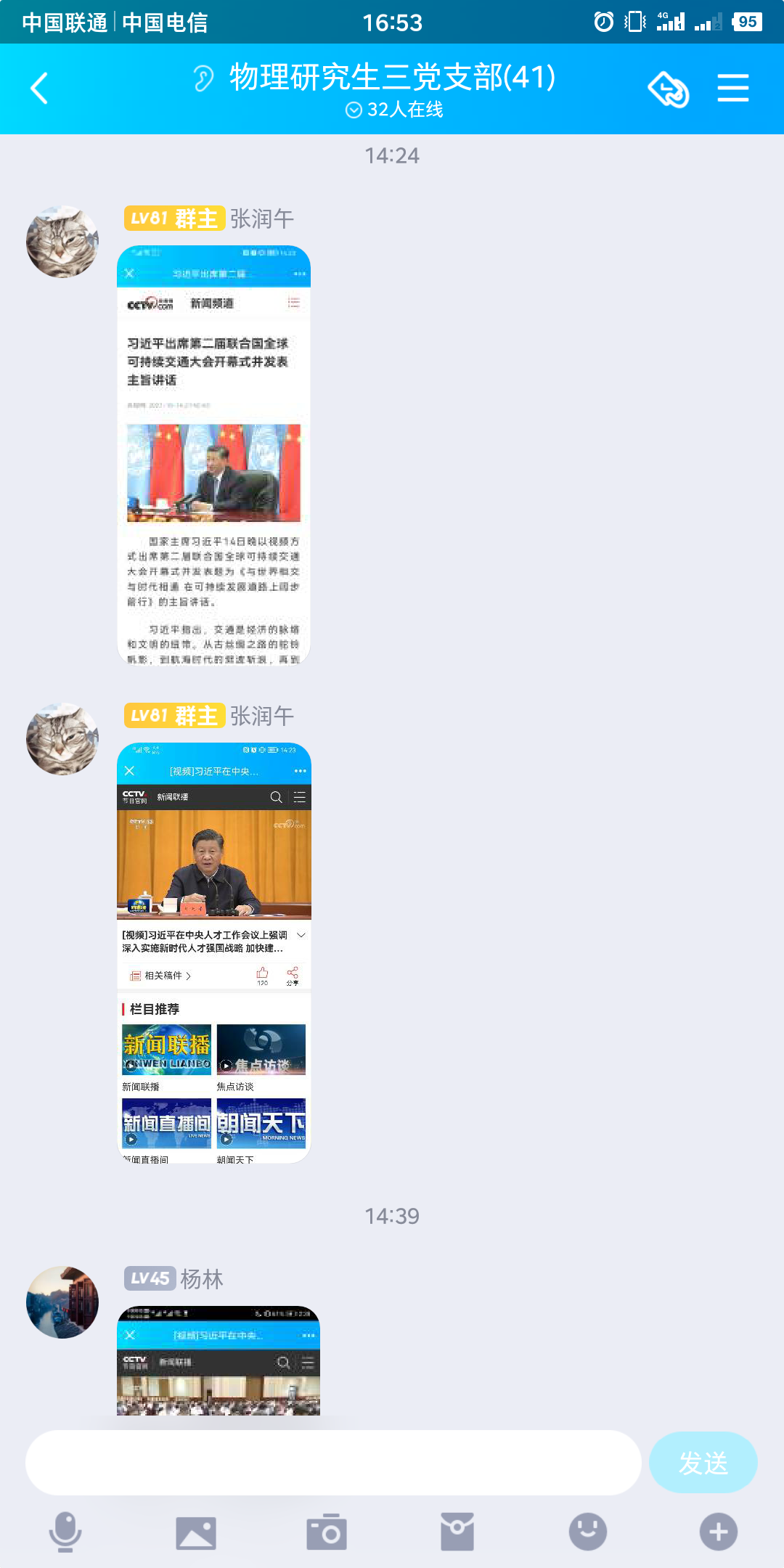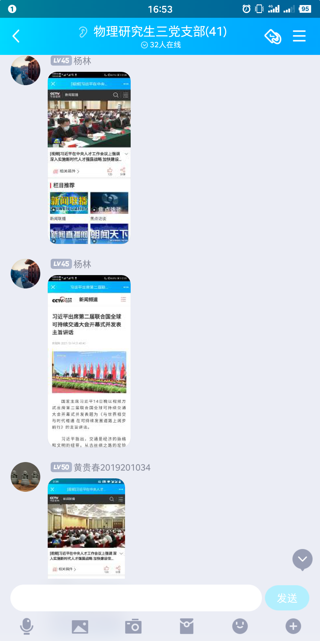 2021年11月4日14:20,物理学院研究生三党支部开展线上自主学习习近平总书记在第二届联合国全球可持续交通大会和中央人才工作会议上的主旨讲话。本次活动由党支部副书记张润午同志组织,物理科学与技术学院研究生三党支部全体党员和预备党员参加了此次活动。