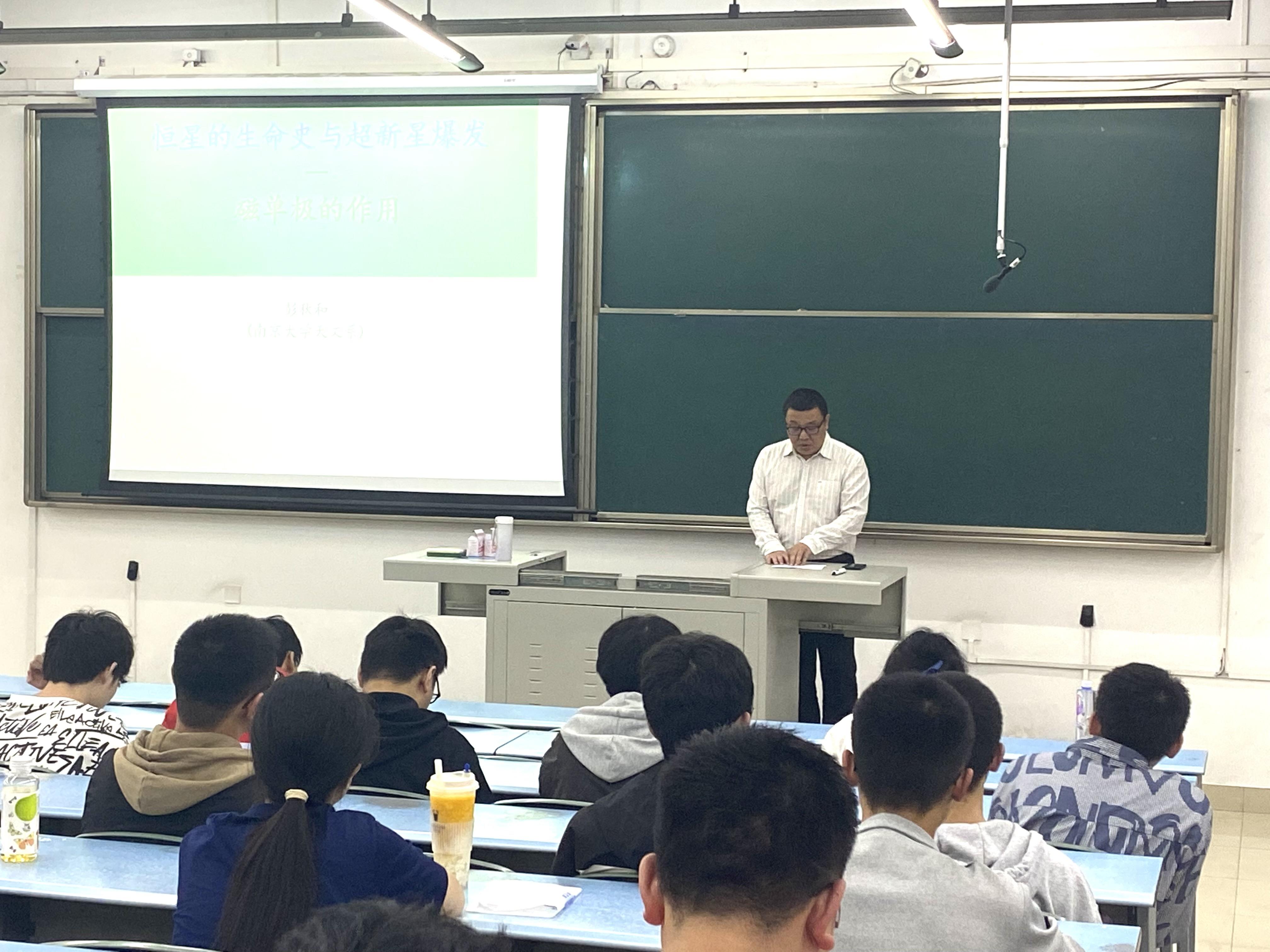 4月13日,南京大学天文系教授彭秋和应邀来到我校,以“恒星的生命史与超新星爆发”为题,结合自身的科研历程,为我校学子讲授了一堂生动的物理课。本次活动由物理科学与技术学院主办,院党委副书记郭剑出席并主持讲座。