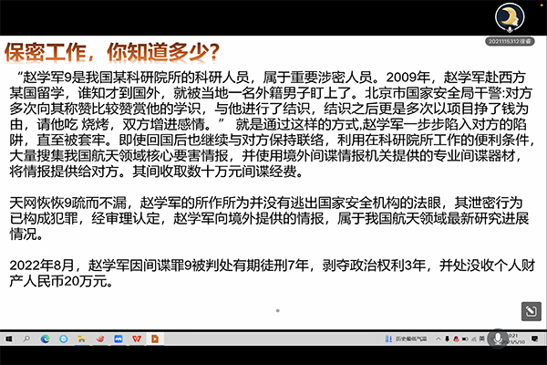 首先,徐睿同学首先由提问形式引出本次活动的主题,同学们积极参与了讨论。接着,徐睿同学向同学们展示了关于宣传国家保密工作的海报以及有关泄密举报的路径。随后,全班同学一起观看了《维护国家安全》等系列短片,受益匪浅。最后,同学们自由发言,讨论此次活动的感想。刘金瑞同学表示,作为普通民众,我们要不断增强保密意识,提高警惕。王梓名同学表示,我们民众应携手共进,共同筑起坚不可摧的国家安全人民防线。
