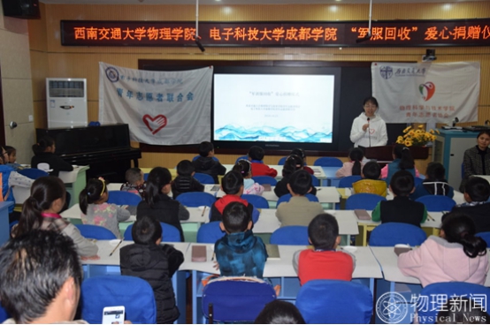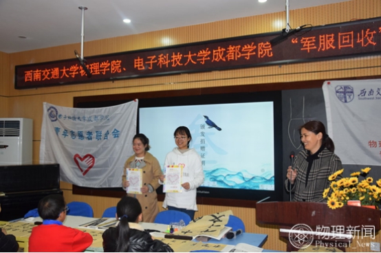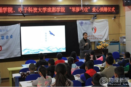 西南交通大学物理学院青年志愿者协会副会长张恬为孩子们介绍西南交通大学后,回顾了军服回收前期活动与善款来源,播放了志愿者们回收军训服过程的视频,展现出物理青协志愿者不辞辛苦为志愿活动无私奉献的美好形象与西南交大捐出军训服的18级学生的爱心。