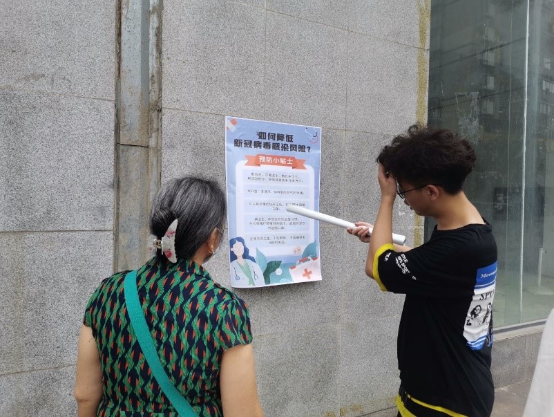 首先,小队成员分成两组,一组负责邀请路过群众聆听讲解,一组负责讲解知识。活动过程中,负责讲解的成员以口头讲解为主,海报等具体书面资料为辅,向路过的民众进行宣传,内容包含后疫情时代在学习、生活、工作等场合需要注意的防范知识,以及新冠肺炎病毒的各种变异毒株、传播途径、感染症状等,针对一些不了解疫情时事新闻的年龄较大的听众,小队成员也耐心地向他们科普了当前国内外疫情发展的严峻形势以及打疫苗的好处,鼓励民众们消除对疫苗的错误认知和恐慌情绪,积极主动地注射新冠疫苗。