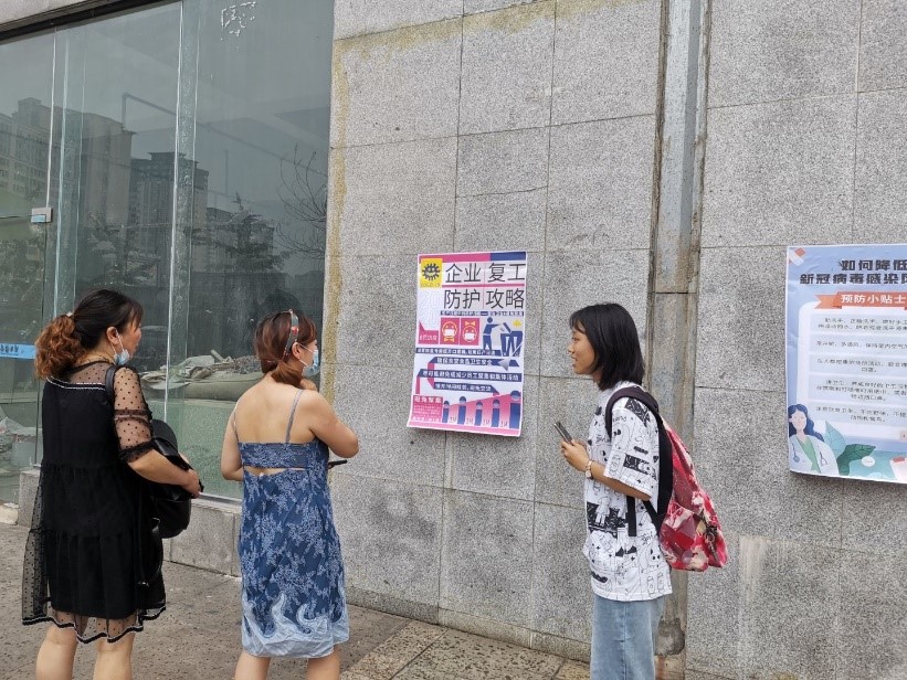 7月7日上午8点整,队伍备好宣传防疫时所需的海报及其他材料,准时从交大出发,首先步行至交大西门外的锦宁巷开始宣传工作。锦宁巷临近交叉路口,街上商店、餐馆林立,街上有西郡兰庭、锦苑两个居民小区,行人较多,因此宣传工作很快就步入了正轨。