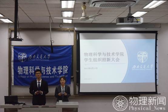 2021年9月17日,物理科学与技术学院主要团学组织招新宣讲大会在犀浦校区X1315顺利开展。宣讲会由唐梓健和王小璐主持,院团委书记门满洲老师,18级辅导员杨颖钊和21级辅导员夏荣林到场,各团学组织主要负责同学和21级新生参会。