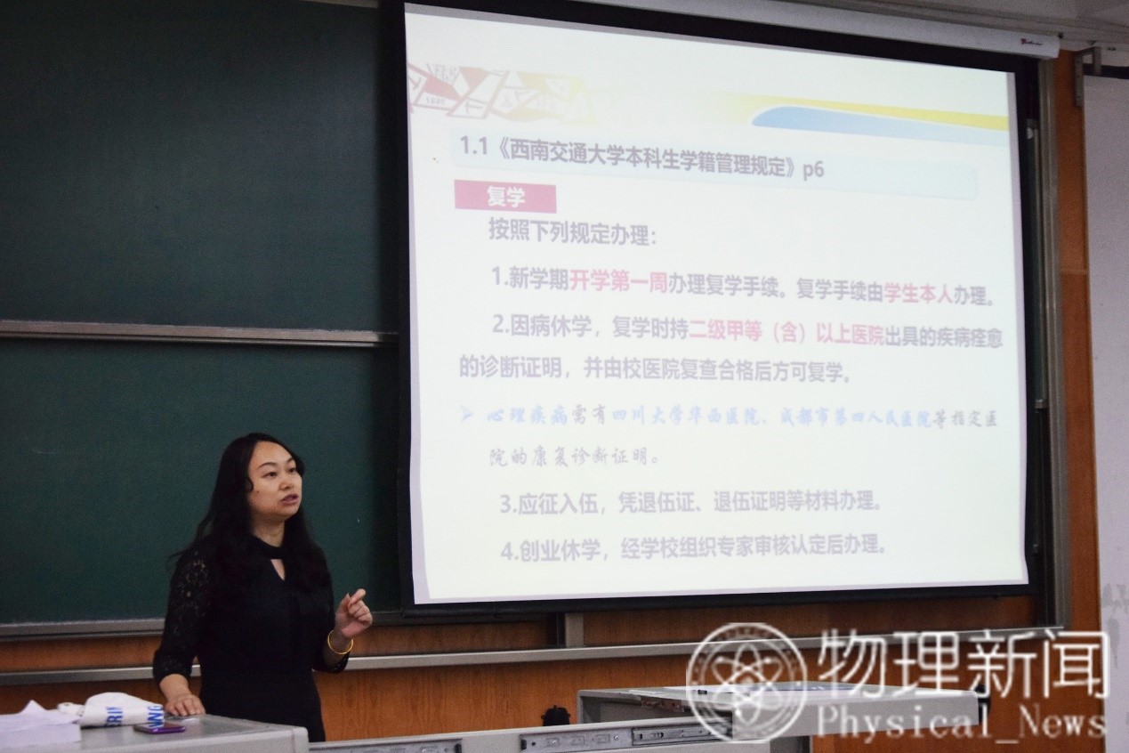 2021年9月24日上午,物理科学与技术学院于X4350教室开展了2021级本科生管理规范讲座。本次讲座由物理科学与技术学院本科生教务老师冯媛主讲,2021级专业辅导员老师龚高秦主持。